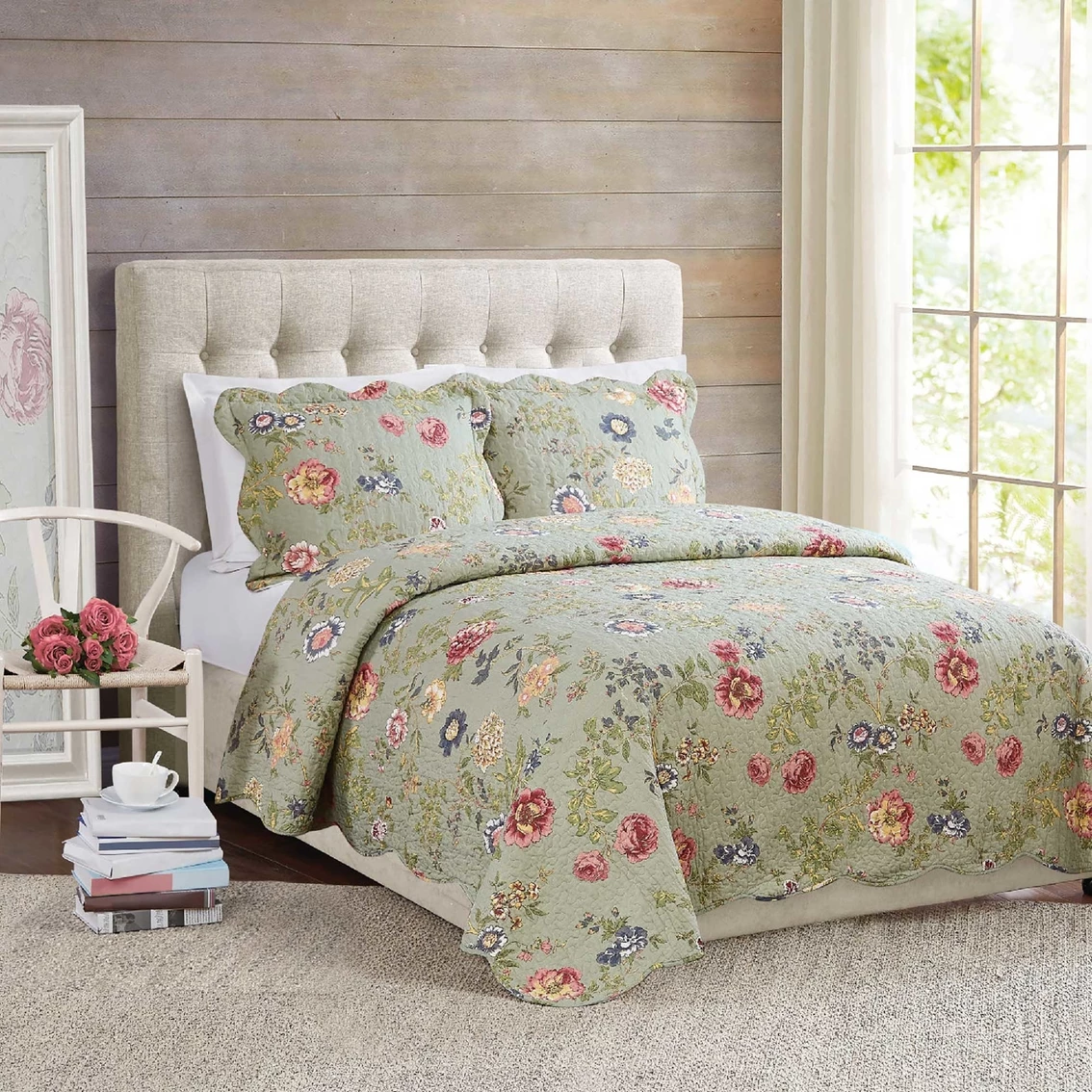 Flowering vines on a bed of sage green with detailed machine stitching and scalloped edges. Edens Garden from American Traditions is a classic quilt used in understated luxury. Includes: one quilt measuring 86 x 86 in. and 2 standard shams 20 x 26 in. 100% Cotton Face cloth with 94% cotton / 6% other fiber fill. Machine Wash cold/gentle, no bleach, tumble dry. Pattern and size may vary due to hand crafting. This item is imported from China. Model: QS2885FQ-2300.