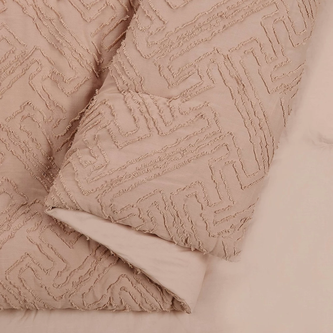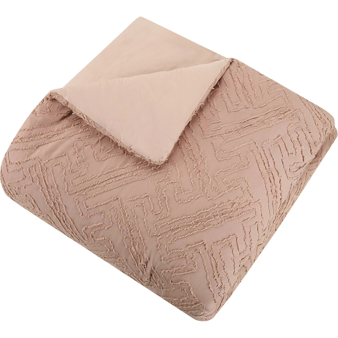 Crafted of cotton in pale dusty pink, the Ayesha Curry Neo Geo Comforter Set features gorgeous, fabric clipped texture in a modern labyrinth design. 3-pc. set includes 2 shams and a comforter. Model: A037918BH.