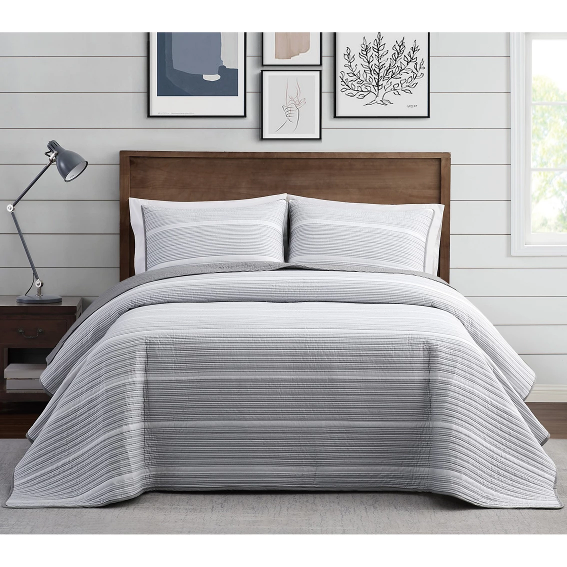 The Brooklyn Loom Niari Yarn Dye Stripe 3 pc. Quilt Set features classic horizontal yarn dye stripes in softer shades of gray and blue or beige and gray. Yarn-dyed color means the color is in the yarn and the fabric maintains its look for years to come. The face is made of yarn dyed cotton and the reverse is a solid color cotton cloth. Model: QS4175BL.