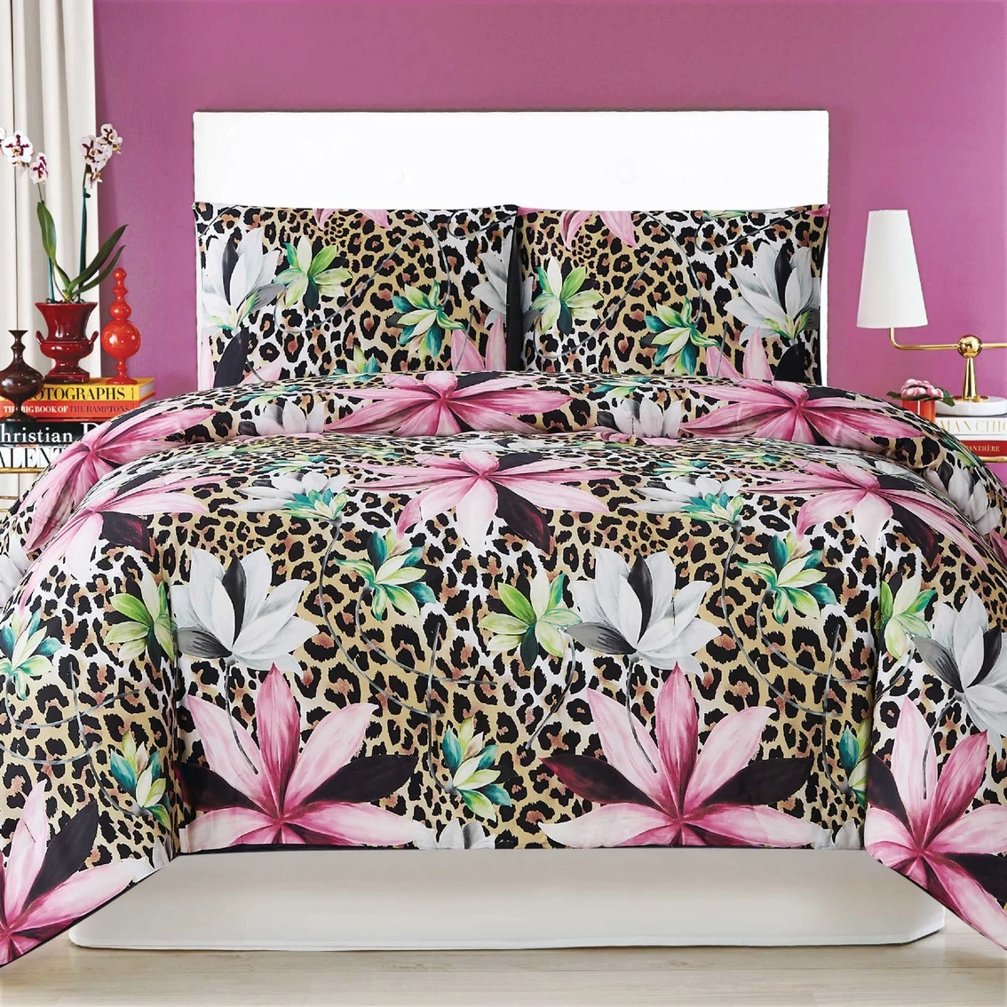 Christian Siriano Tahati features large pink blossoms overlaid on a background of leopard skin as the main print for this bedding ensemble. Includes one comforter and two shams. Face and back of the comforter and shams are 100% cotton woven cloth. Comforter is filled with 100% polyester fiber filling. 3-pc. set. This item is machine washable, but please be sure to use appropriate sized machinery to avoid any excess wear on the items. Model: CS3217.