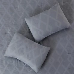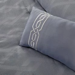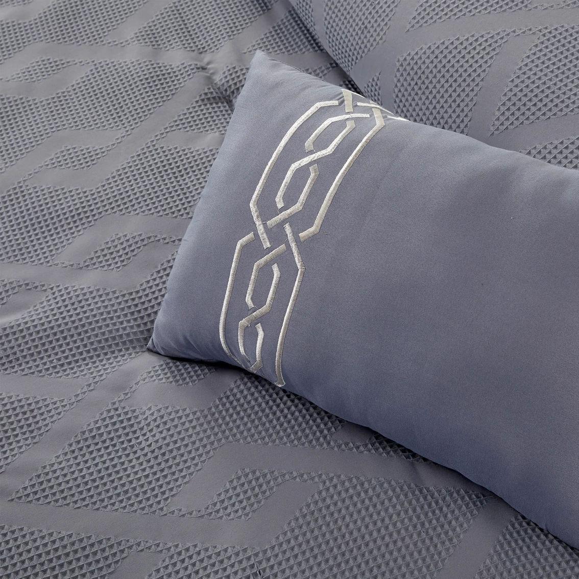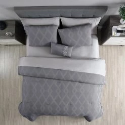 This handsome set features a beautifully unique waffle texture with a jacquard interlocking diamond design, creating a great look for any bedroom. The soft hand fabric is on both the comforter and face of the shams. The solid coordinating back allows you to use the comforter on either side for a different look. This mid tone grey palette can work with any style of decor; lending itself best to a more modern and contemporary appearance. This set includes a 4 piece sheet (1 Fitted Sheet, 1 Flat Sheet, 2 Pillowcases), 1 Comforter, 2 Pillow Shams and 1 Decorative Pillow. Style: 3MLTICSE-HLY-QN.