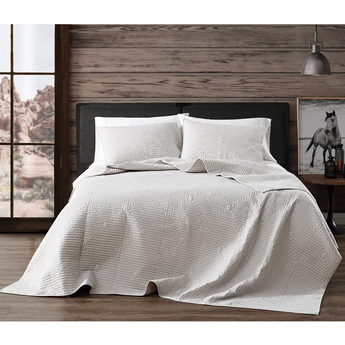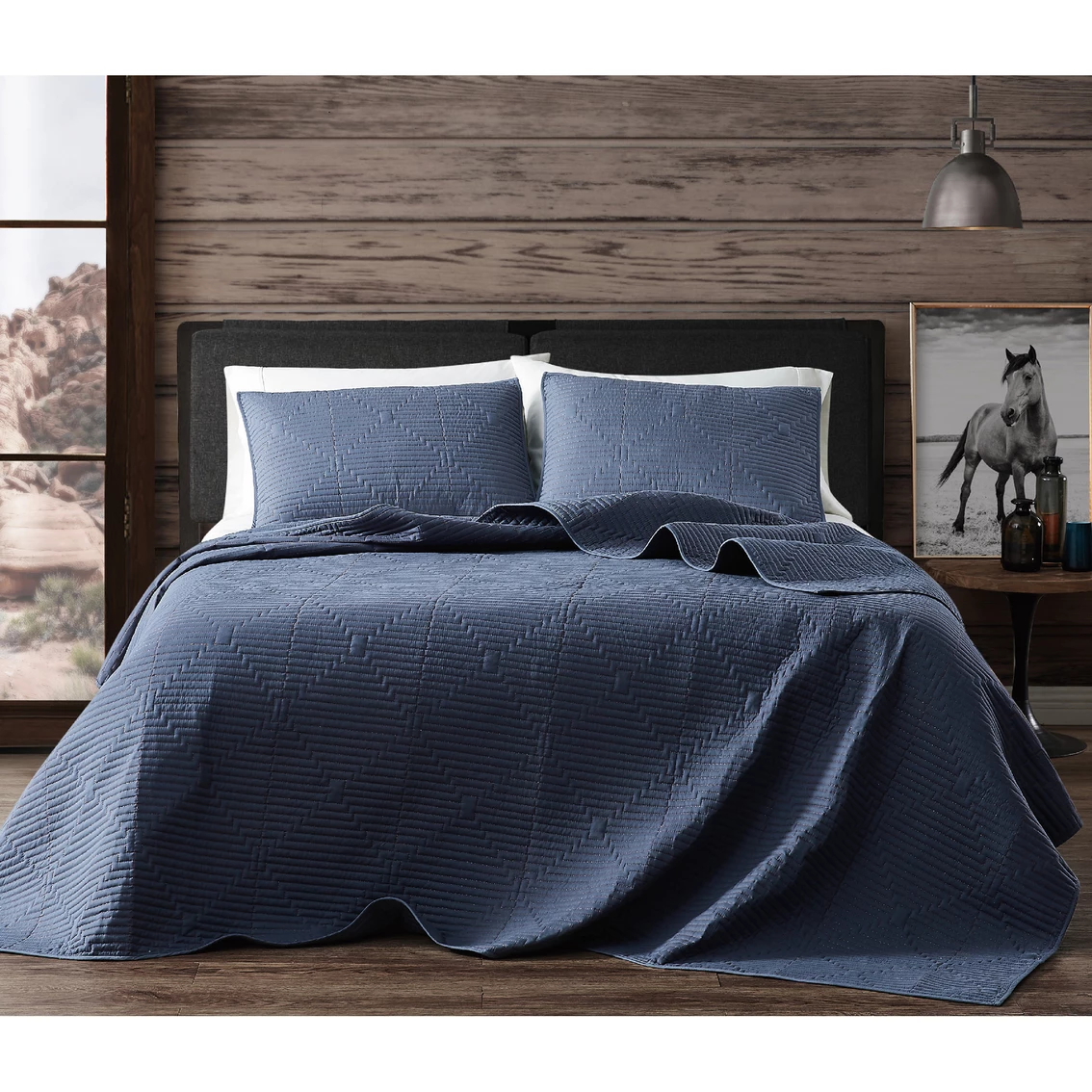 Give your bedroom a stylish upgrade with the Ray Pick Stitch Embroidered Quilt Set From Frye. This 100% cotton bedding set has a gorgeous embroidered geometric pattern that will be the focal point of your room. Filled with 95% cotton and 5% polyester, this quilt is plush, soft and made for comfort. This set includes two shams and one quilt. Model: QS4388BLFQ-2300.