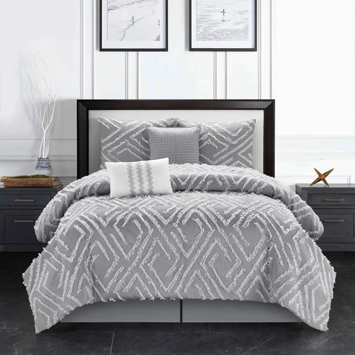 Relish a peaceful retreat with this stylish 5-piece comforter set. Fabulous embroidery and quality stitching adorn the comforter and shams while a geometric print embellishes the pillows to rejuvenate the appearance of your master suite or guest room. This grey and white themed bed set comes with (1) cozy comforter and two (2) shams that match the design of the comforter. Two (2) ornamental pillows fashionably complete the shabby elegance of this bedding set. Made of soft polyester fiber, this comforter set is machine washable and can be put in a dryer to keep it fresh and clean. Style: Damita5-FQ-GRYW.