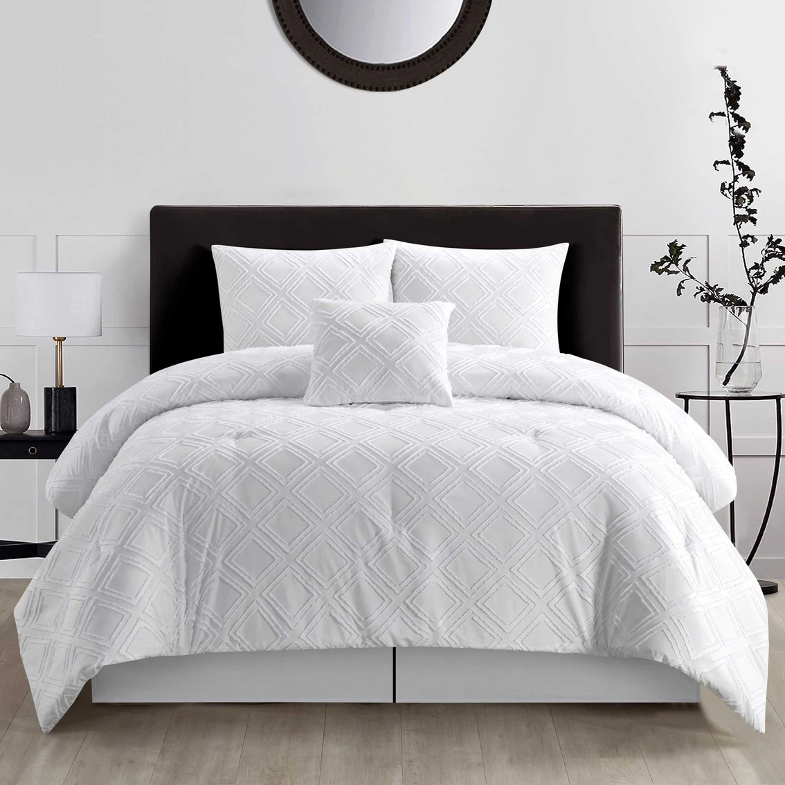 Turn your bedroom into a slumber retreat with this beautiful and elegant comforter 5-pc. set Grand Avenue featuring an eyelash 3D clip jacquard technique in double diamond pattern for a cozy surface. This is a quick refresh to your bedroom decor that works for a variety of lifestyles such as casual elegance, farmhouse and back-to-school. Constructed of 100% polyester fabric and filling, this bed set comes with 1 comforter, 1 bedskirt, 2 shams and 1 decorative pillow that flaunt excellent workmanship and quality. The complete bed set built to last, this bedding set is made with strict quality control standards and comes with everything you need for a complete bedroom makeover. Made with high strength polyester, this beautiful bedding set can be machine washed and dried on a low tumble setting for easy care. Model: Ramsay5-Q-WHT.