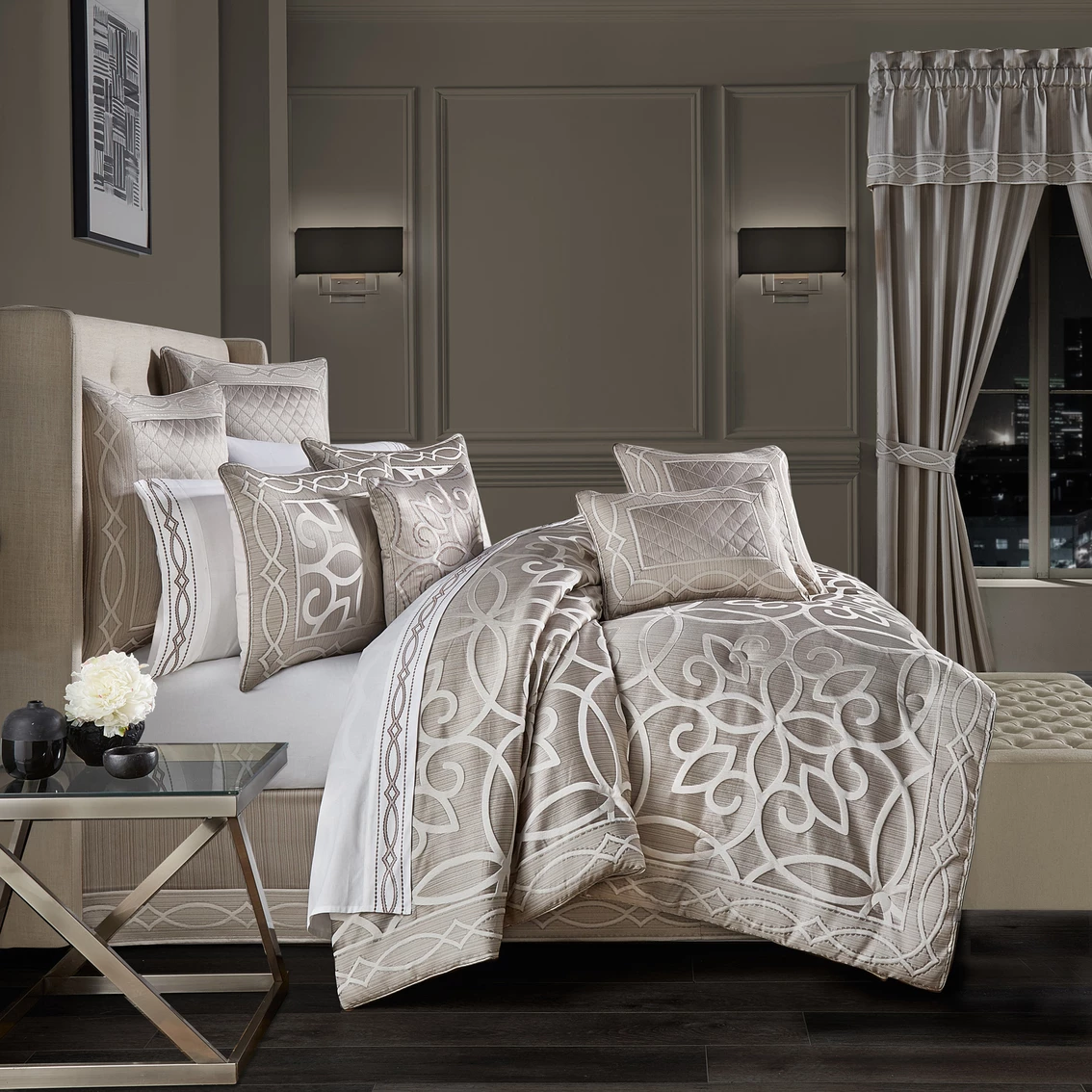 The Deco 4 Piece Comforter Set Collection by J. Queen New York features a highly constructed sleek engineered jacquard with bordered edges. This alluring modern geometric motif is constructed with a puff technique which sits on a lustrous stria satin ground in industrial silver tones. This comforter is generously oversized and overfilled for a sophisticated look. The matching hidden zipper closure pillow shams are engineered with a sleek border showcasing the geometric motif. The bedskirt has extra length and is constructed with a split corner tailored finish and the coordinating stria satin is bordered with a geometric puff jacquard finish. Coordinated deco accent pillows, shams, and window treatments by J. Queen New York are available separately. Model: 2560046.
