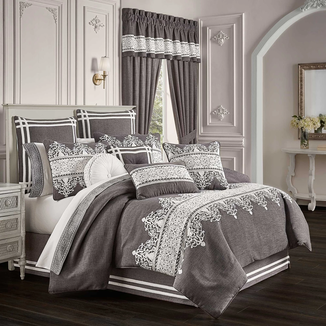 Flint from J. Queen New York is a beautifully embroidered highly detailed luxury bedding collection. White damask embroidery runs horizontal across the heathered charcoal grey faux linen comforter. The oversized comforter is embellished with 1/4 in. piping. The four piece set includes one comforter and two perfectly matched padded pillow shams with a hidden zipper. The pillow shams are engineered, centering the embroidered damask and finished with 1/4 in. piping. The bedskirt is a solid faux linen with 2 rows of gimp running at the bottom. This ensemble will add designer elegance to your bedroom decor. Set includes 1 comforter, 2 standard shams and 1 bedskirt.
