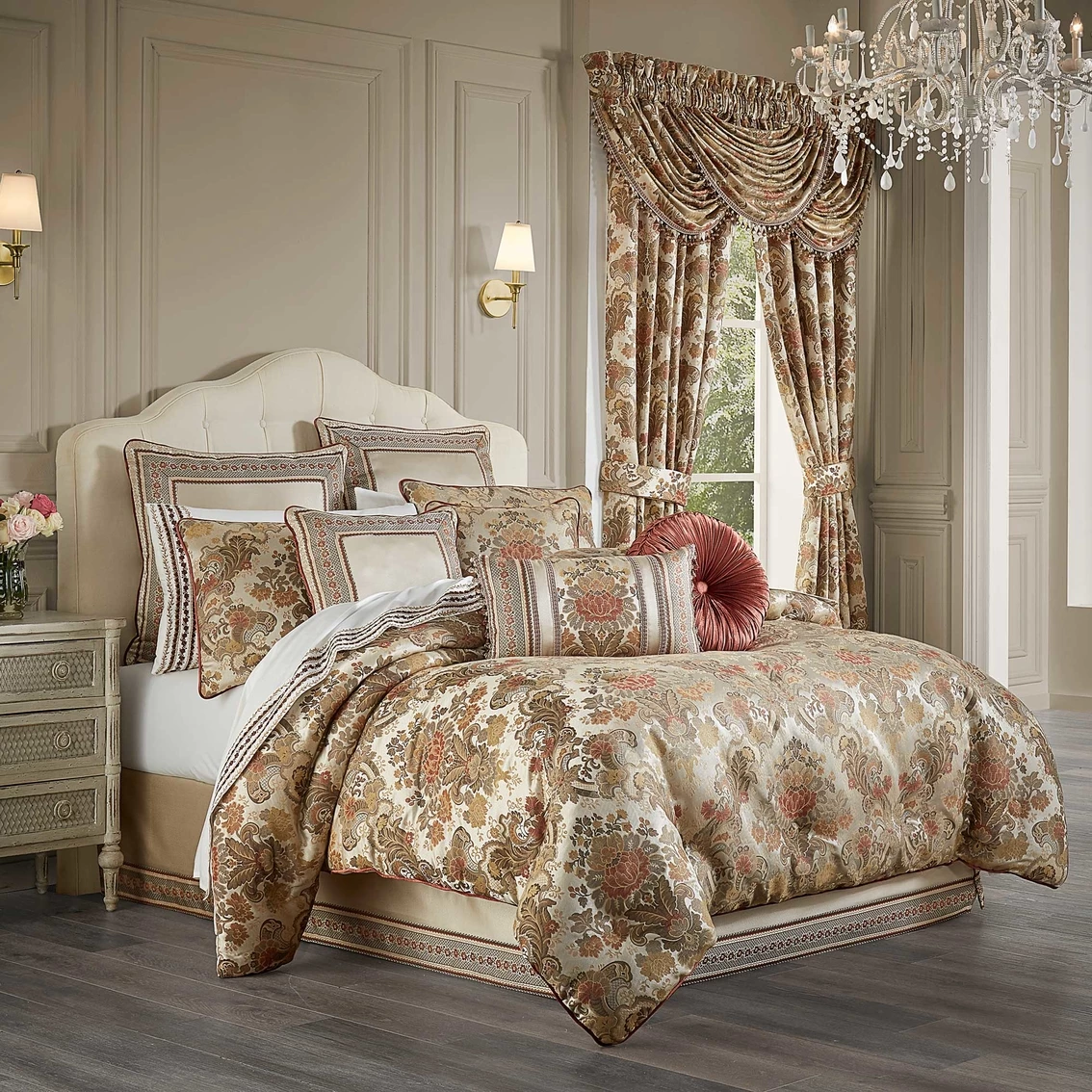 The Juliette 4 Piece Comforter Set Bedding Collection by J. Queen New York is exquisite with its fine details and bold use of beautiful terracotta, taupe and beige colors. This beautiful woven jacquard floral pattern is sophisticated with a gorgeous satin finish detail. This luxurious comforter includes matching hidden zipper closure pillow shams and a beige satin split-corner bedskirt with a detailed jacquard border that features matching terracotta tones. This oversized bedding ensemble will make you feel like a royal and add elegance to your home decor. The reverse of this set features a plush microfiber fabric dyed to match the beige ground of the floral jacquard and is finished with a .25 in. terracotta velvet piping. Pair this collection with the Juliette throw pillows, shams, and window treatments by J. Queen New York to complete the look. Model: 2613174QCS.