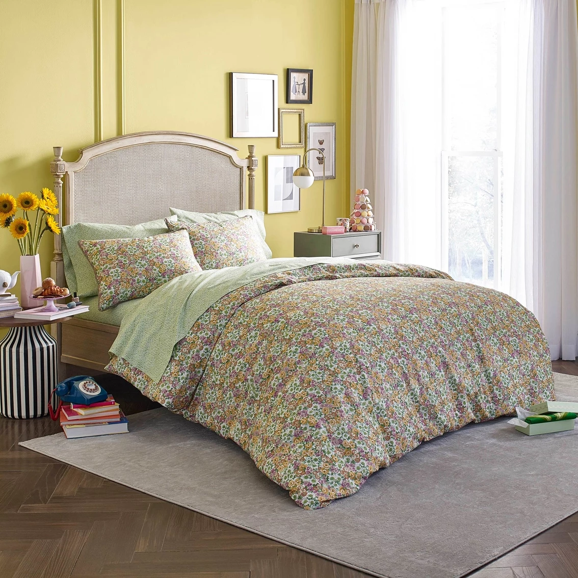 Each Full/Queen and King set comes with one comforter and two shams, while Twin/TwinXL sets include a comforter and a single sham. Complement the Christina comforter set with the Lady Pepperell Edith floral bed sheets for a two-tone take on of-the-moment mixed prints that dial up the drama of your decor and add pop and personality to your interior theme. Fabric is made of 100% cotton percale. Fill is made of 100% polyester. Shams are constructed with a center back overlap closure. Sheets and pillows sold separately. Set Dimensions: Full/Queen: Comforter: 88 x 92 in. Shams: 20 in. x 26 in. Model: 1C36635.