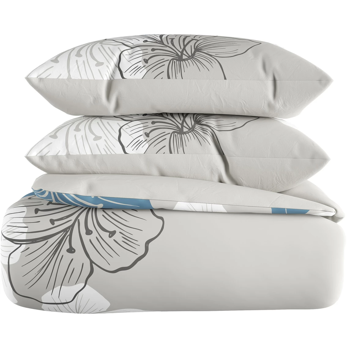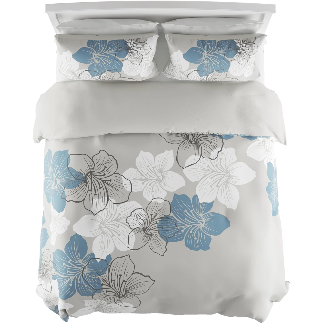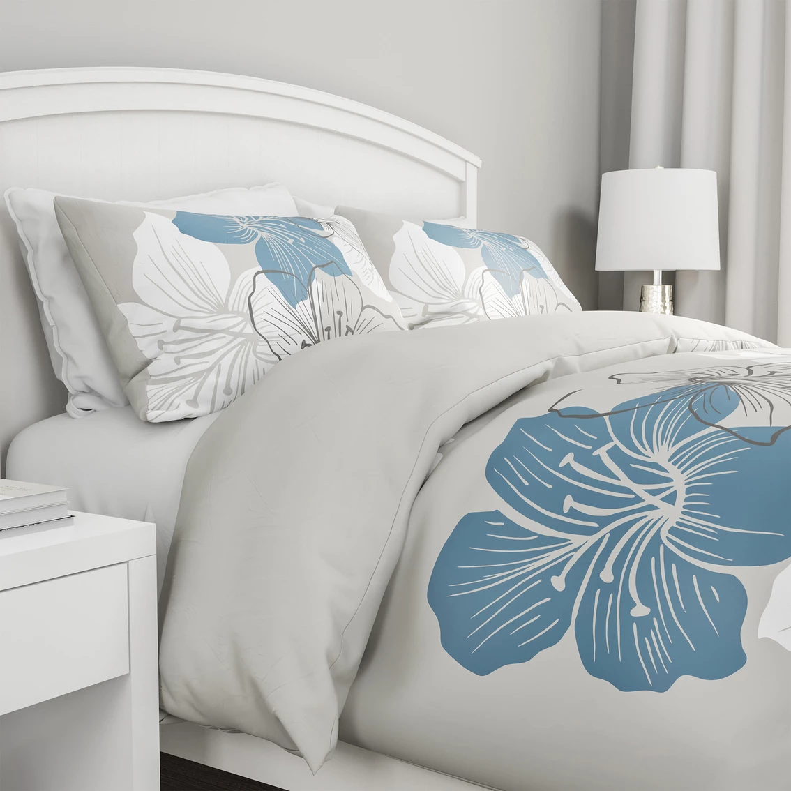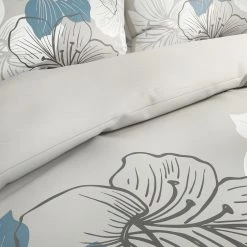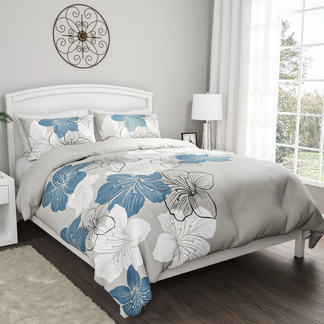 Dress your bed lavishly with the 3-Piece Floral Comforter and Bedding Set by Lavish Home. This set features an exclusive design by Heather Dutton with a white and blue hibiscus floral print and a soft gray background that is sure to complement almost any bedroom decor. The set includes a comforter and 2 matching pillow shams. The comforter is made with 100% 300 GSM polyester filling to provide the same warmth and comfort as down feather comforters without triggering allergies. The filling doesn’t clump and shift like goose down and is breathable for year-round use. The bedspread and shams are breathable and lightweight enough for a luxurious and cozy experience all year-round. Both the comforter and shams are machine washable in cold water and tumble dried on low for convenient care. This ensures they will stay soft and beautiful night after night.