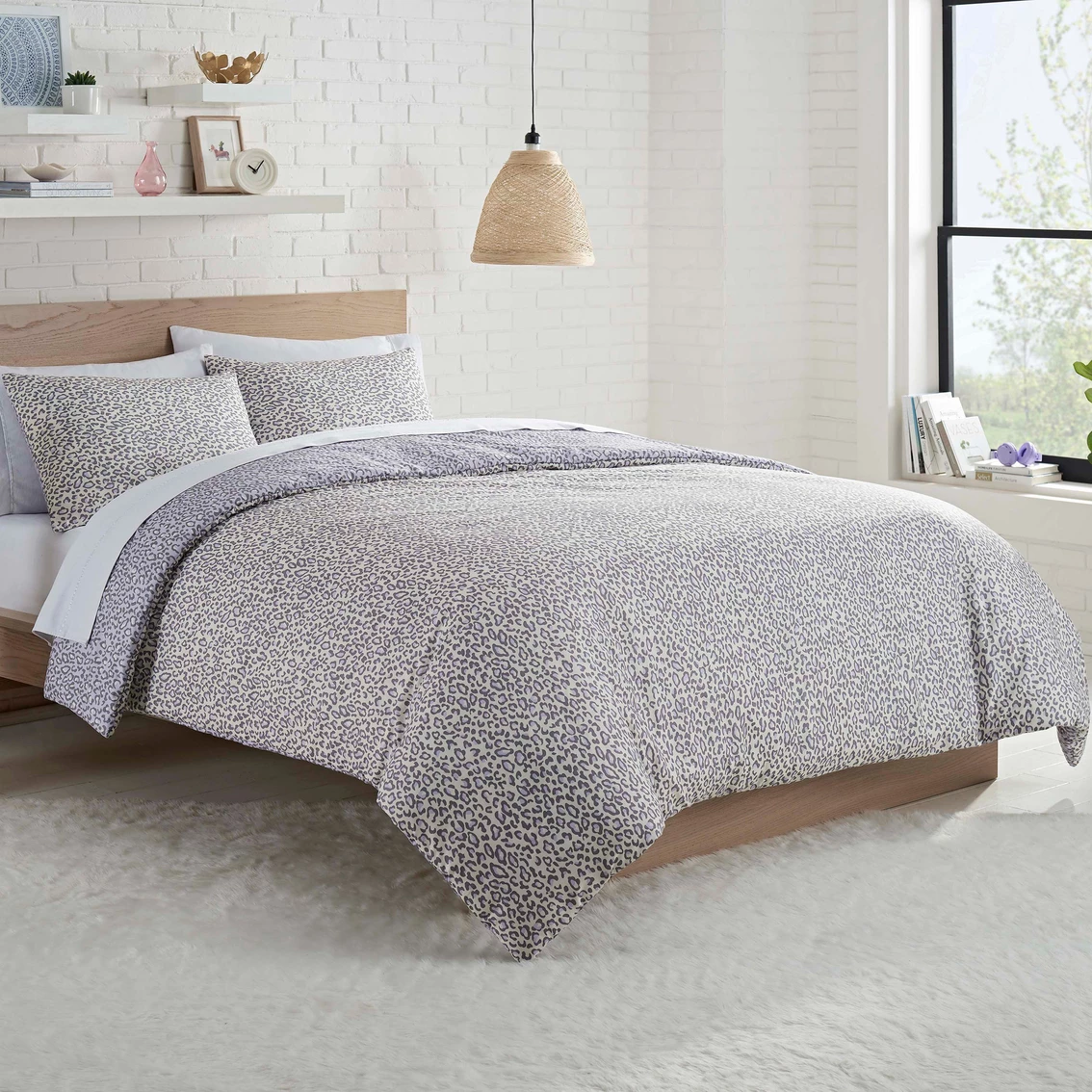 Perhaps the purr-fect bedding ensemble, the Lemon Tree Paloma Comforter Set flaunts a fierce and on-trend cheetah print. The front of the comforter and shams feature Ivory Cheetah, and the backs feature Lavender Cheetah. The lofty comforter has an airy fill that provides insulating, all-season warmth when you wrap up for a good night’s sleep. The set’s 100% polyester fabrication is designed to be easy care, so it’s machine washable and dryer safe, and maintains a soft look and feel. Machine wash cold on gentle cycle with similar colors. Do not bleach. Tumble dry low, remove promptly. Warm iron on shams as needed.