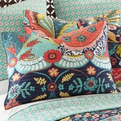One of Levtex Home’s most popular quilt sets, Jules is inspired by classic art piece with a teal, blue, pink, orange design and a charming reverse pattern of teal architectural tile icons. A bound border provides contrast and texture to complete the look. Made from 100% cotton that will never ever feel heavy, stiff or uncomfortable, the Jules quilt and pillow sham set has an ultra soft feel that you’ll simply love. The quilt is very generously sized to give your bedroom a feeling of comfort and luxury. Used by itself as a layering piece or as a bedspread, this bedding set is extremely versatile. Model: L11480.