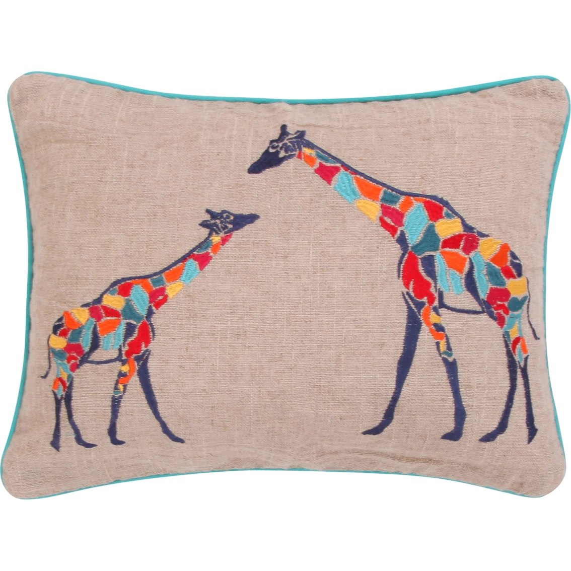 The Mackenzie Giraffe Burlap Pillow from Levtex Home is inspired by rich bohemian patterns. This attractive pillow matches back to the Mackenzie bedding collection but can be used as a versatile accessory in any room in your home. Pillow features two giraffes embroidered with colorful mosaic detailing on a natural burlap ground. It is framed with a teal binding and has a solid bright teal canvas back. Pillow includes feather insert. Style: L71600P-C.