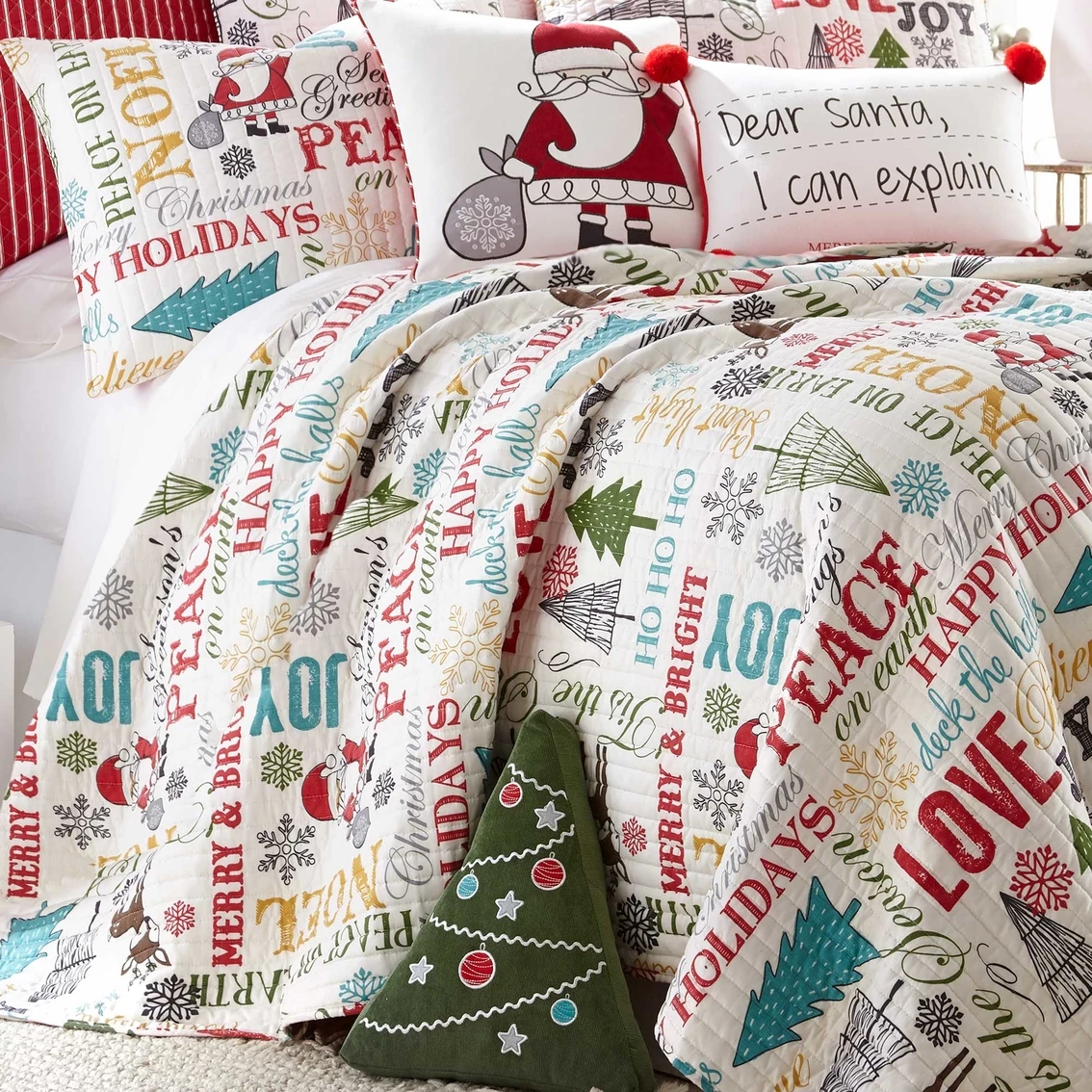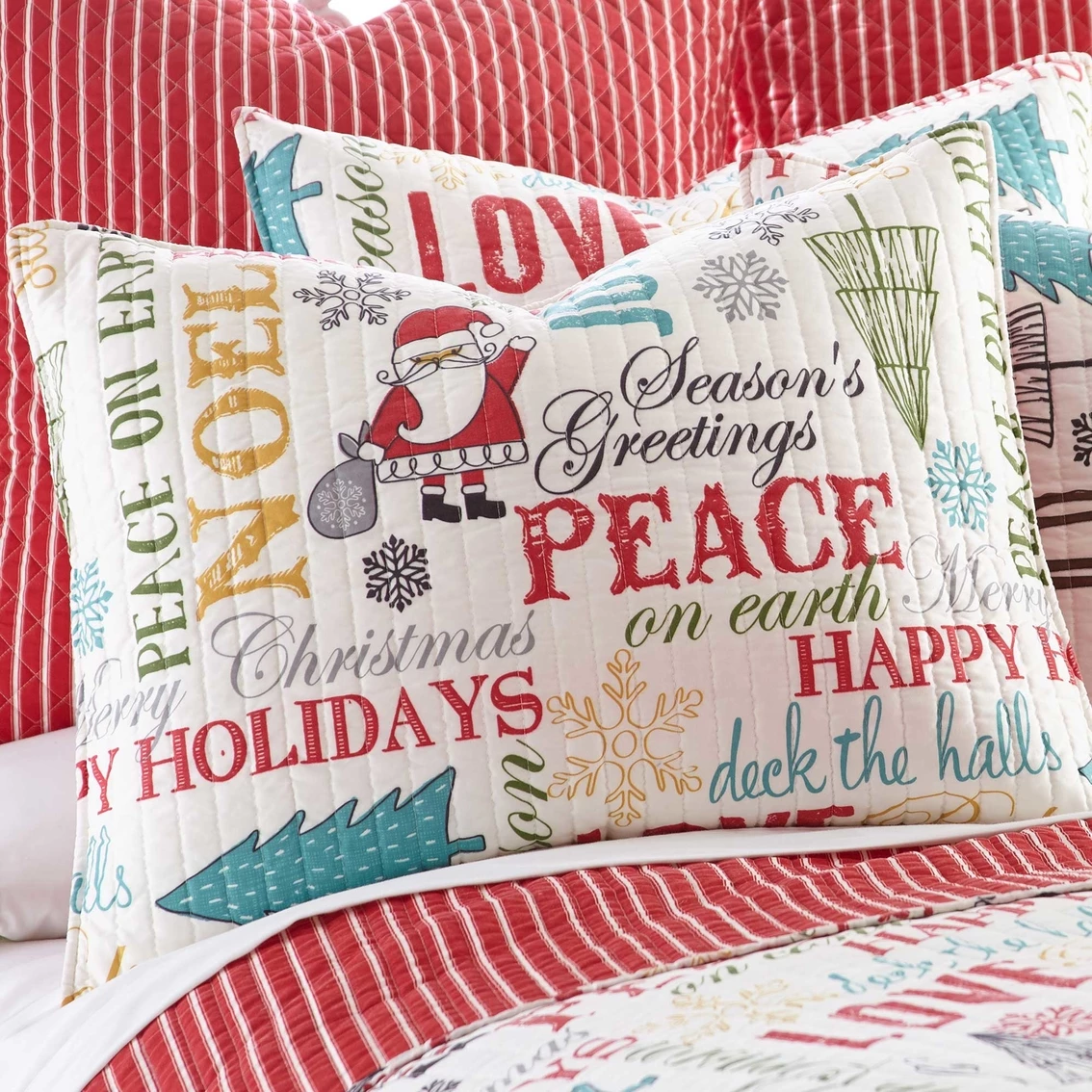Add bright and cheerful styling into your bedroom with Levtex Home’s Santa Claus Lane Reversible Quilt Set. Including a holiday-inspired quilt and coordinating pillow sham(s), this quilt set will easily enhance your Christmas decor. Features allover multicolor holiday text with Christmas images on an off-white ground, and reverses to red and white stripes. Style: L11220.