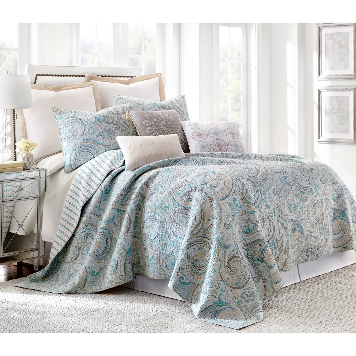 Give your bedroom a lively update with the Levtex Home Spruce Spa Quilt Set. Featuring a calm and unique paisley pattern in spa blue, grey and taupes, this quilt reverses to a spa blue diamond stripe pattern on a cream ground. This set will lend a fashionable update to your bedroom. Style: L40804FQS.