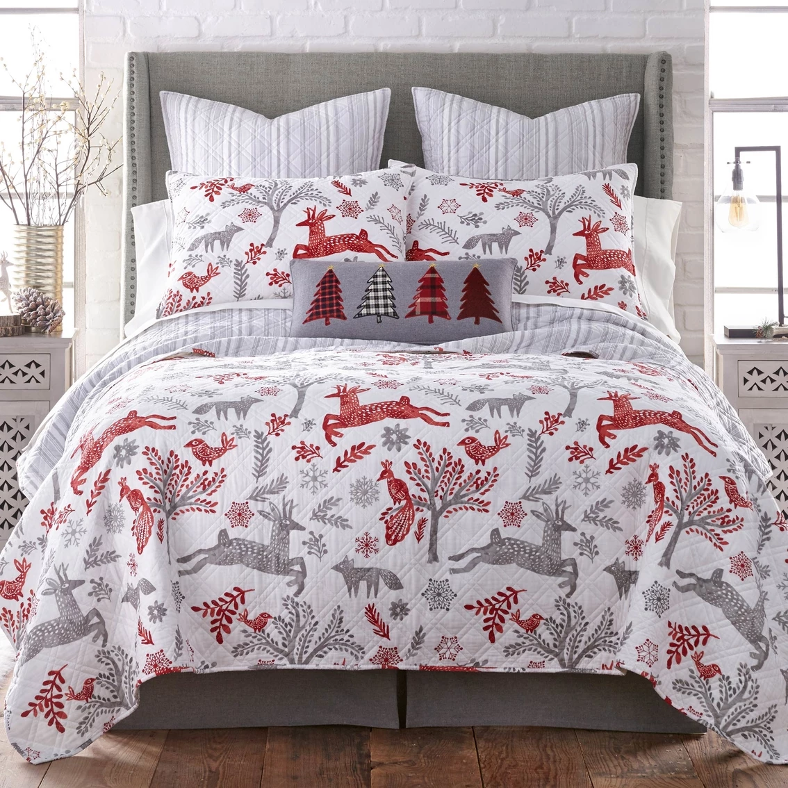 Levtex Home’s Winterland Reversible Quilt Set brings warmth and festive style into your bedroom. This beautiful quilt set features an reindeer, snowflake and tree design in grey and red hues, and reverses to a grey striped pattern. Made of the softest 100% Cotton, the full/queen quilt set includes a 88×92″ full/queen quilt and two matching 20×26″ standard shams.