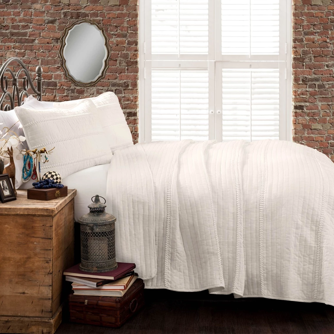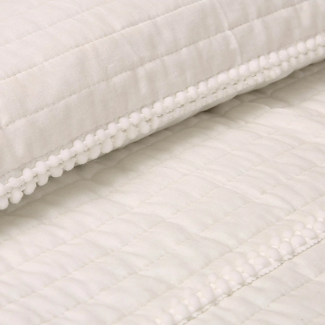 The Pom Pom Stripe Quilt Set is perfect for the minimalist and lovers of farmhouse decor. The stripes add texture to the design and the pom-poms add the perfect feminine touch. Set includes quilt and 2 sham. Model: 16T0016.