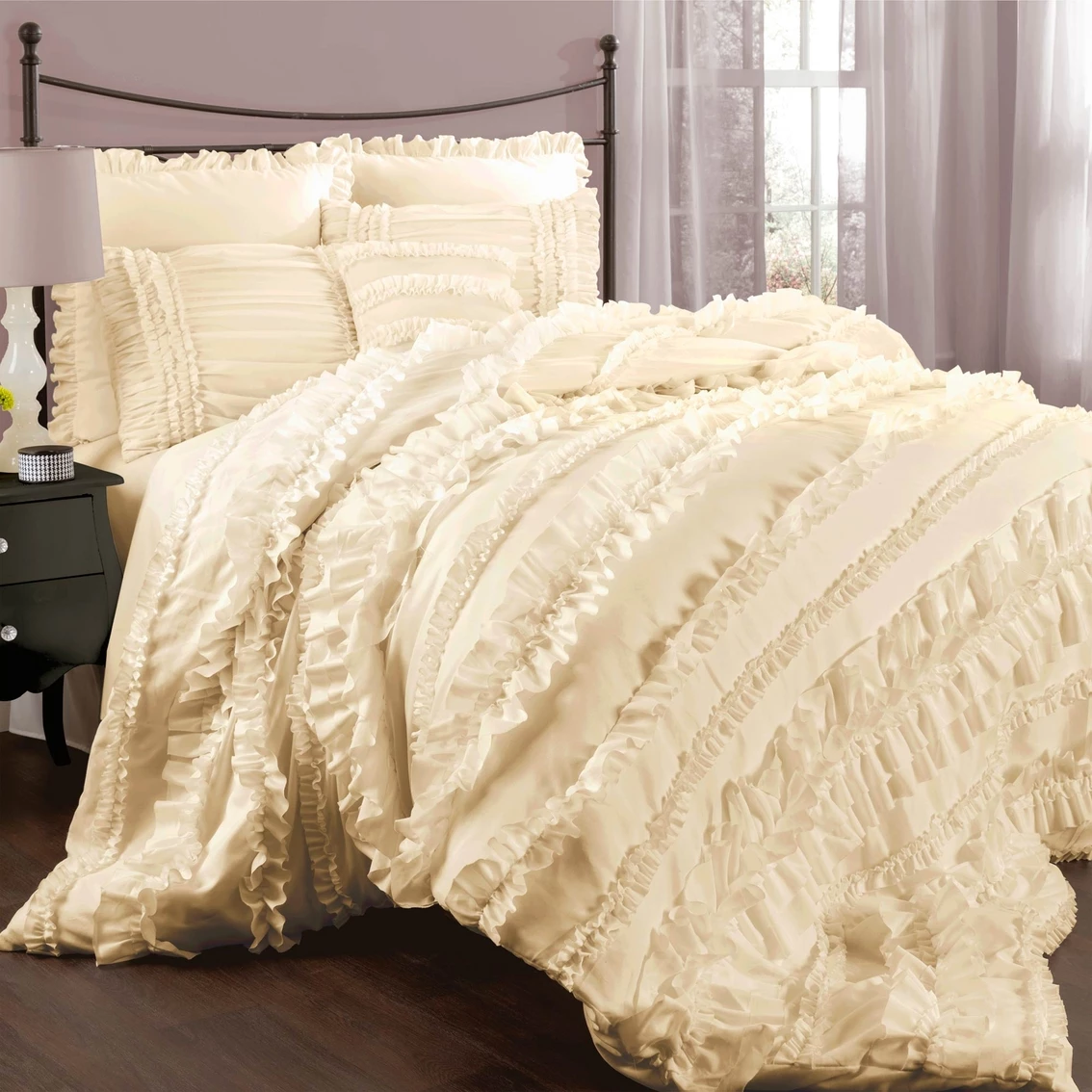 Add the essence of frilly and pretty to your bedroom with this Belle 4 pc. Comforter Set from Lush Decor. The layered ruffles create luxurious dimension as they cascade over the bed. The brushed poly fabrication is so soft to the hand you’ll just want to surround yourself with this comforter. Includes a comforter, two shams and bed skirt.