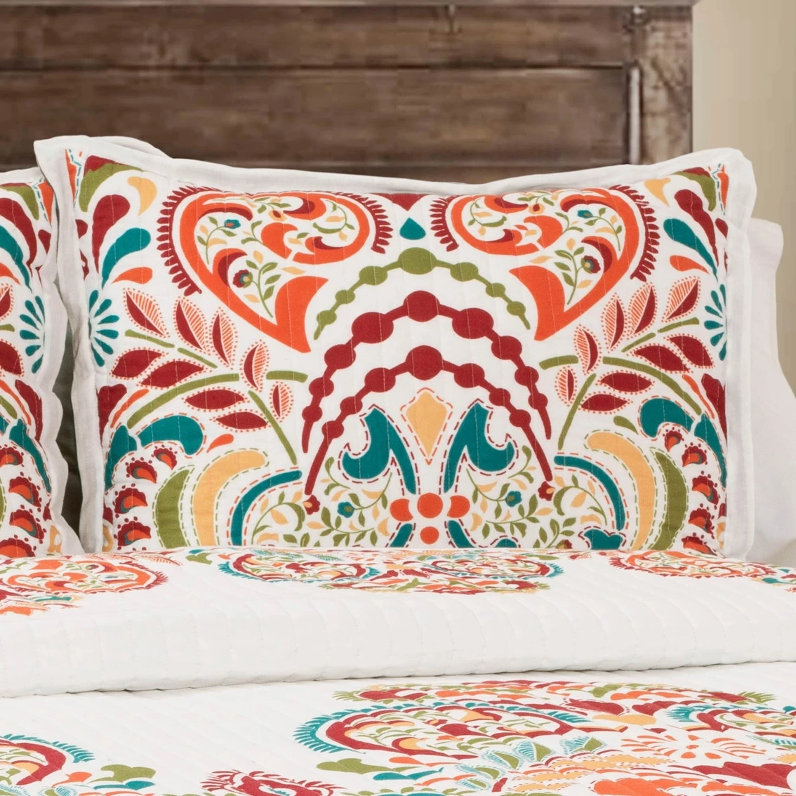 The intricately laid out design of this Clara 3 pc. Turquoise Quilt Set from Lush Decor explodes with vivacious colors that tingle your senses. It offers modern-age beauty combines with artistic Bohemian flare. Includes a quilt and 2 shams.