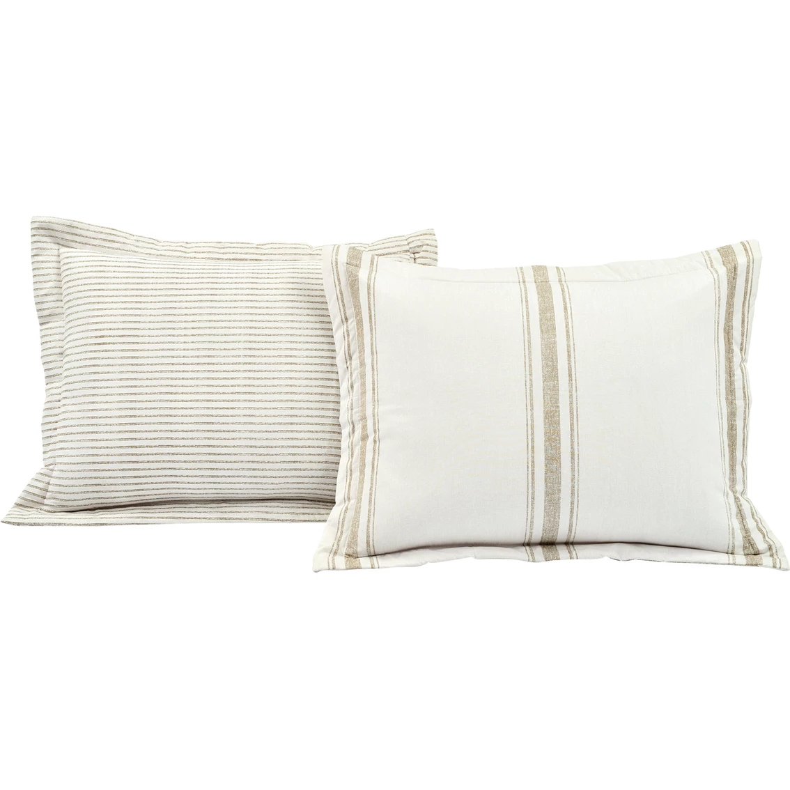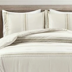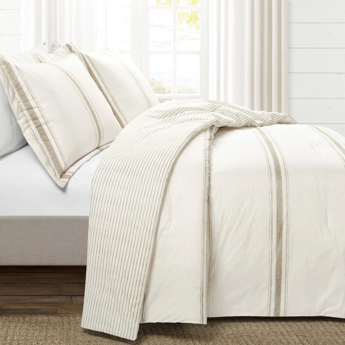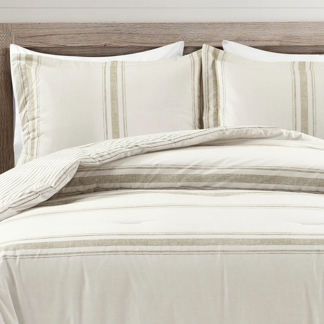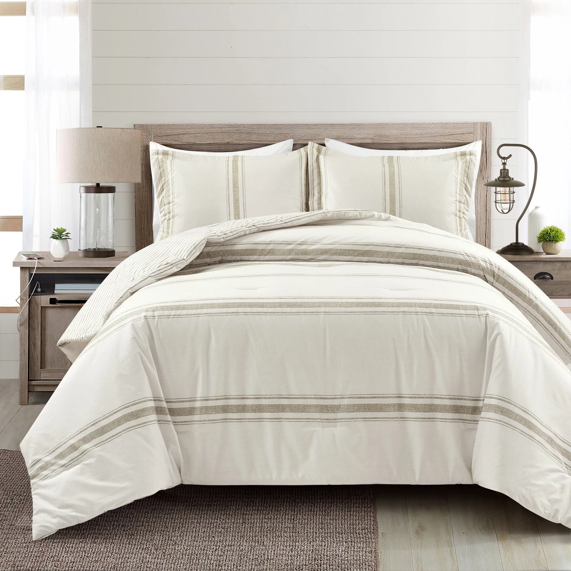 Decorate your master or guest bedroom with traditional farmhouse style from Lush Decor. The printing on this set is reminiscent of shiplap beams. This 3-piece set includes a reversible cotton comforter and 2 matching pillow shams. The back features a pinstripe print. Style: 16T005564.