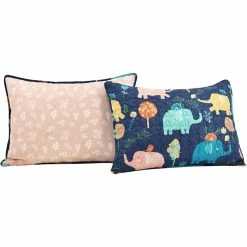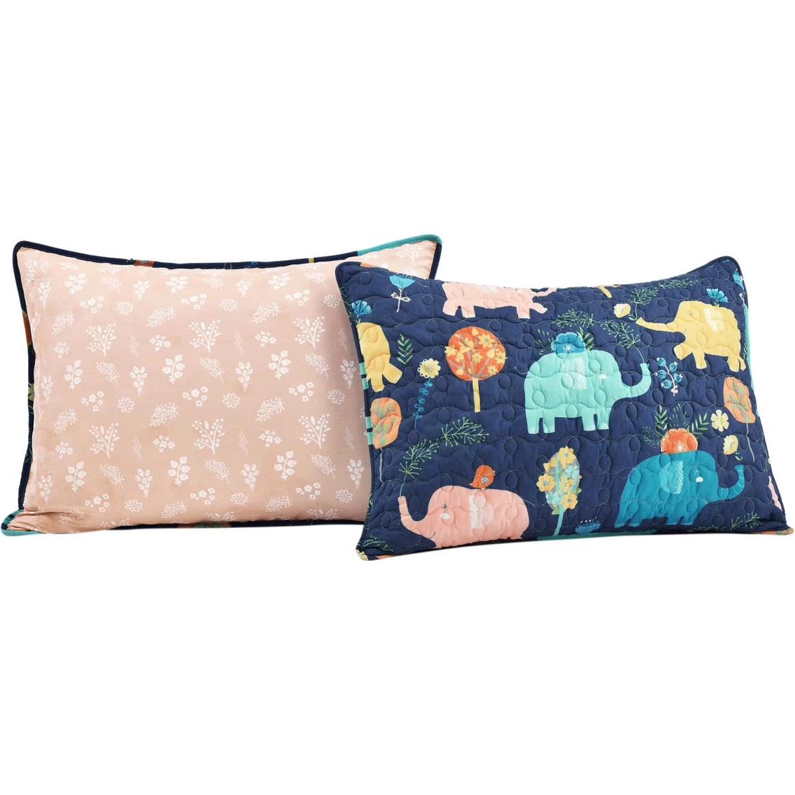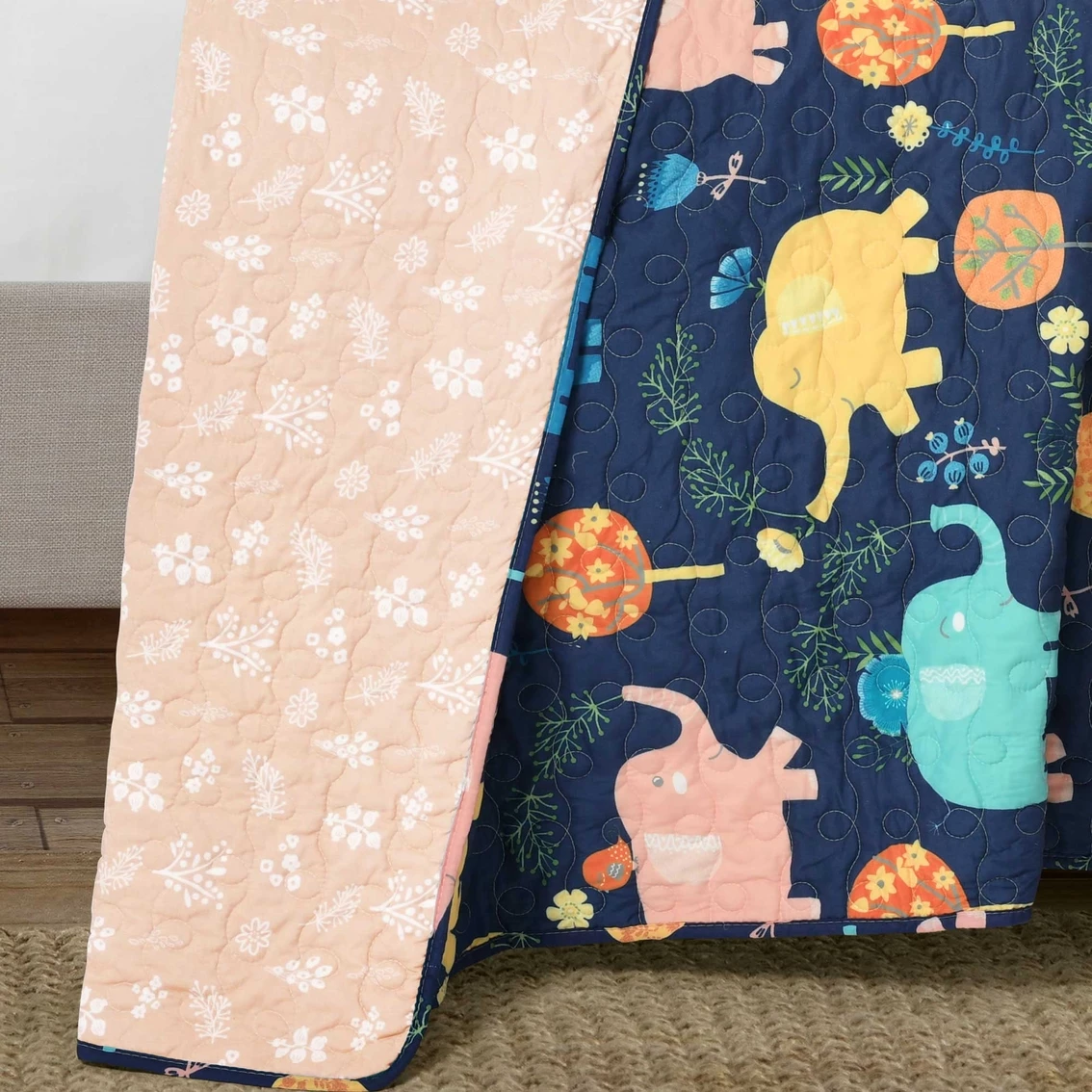 Elephants symbolize strength, honor, patience, luck, fortune, and protection. Decorate your child’s first big kid bedroom with this reversible Lush Decor Hygge Elephant Quilt Set featuring an adorable pattern of playful, colorful elephants frolicking among the trees. Model: 16T006866.