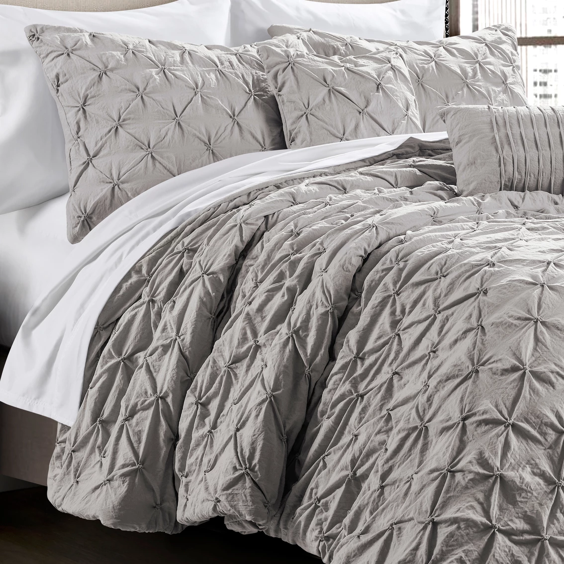 The Lush Decor Ravello Pintuck 5 pc. Comforter Set features gorgeous hand tucking detail on crinkle microfiber. Complete with two matching shams and two matching decorative pillows, this super soft bedding provides luxurious comfort for the minimalist bedroom. Set includes 1 comforter, 2 pillow shams and 2 unique decorative pillows. Style: 16T003916.