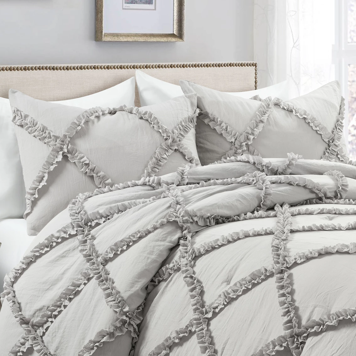 The ruffled detail and diamond pattern on this comforter set from Lush Decor creates an interesting and beautiful look for your bedroom. The frilly ruffles add a feminine touch and texture to an otherwise minimalist design. Style: 16T00445.