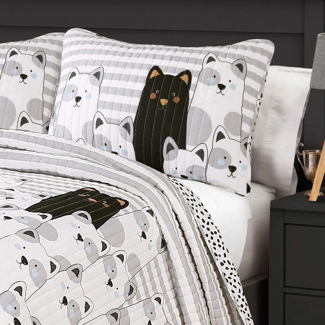 This two-piece quilt set features an adorable pattern of bears and thin pin stripes printed on 100% cotton. The set includes a reversible quilt and a matching sham, giving you two looks in one trendy set. Ideal for children, teens and young adults. Style: 16T003153.
