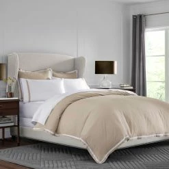 The Martex 2000 Series Ultra-Soft Microbrushed Duvet Cover set is luxurious and versatile, and fits into any bedroom – from the master suite to the guest room. Made with a buttery microbrushed fabric, the set offers a silky hand feel and an elegant look for your bed. The Duvet features inside corner ties to keep your duvet insert in place, and a hidden button closure and both the duvet and shams feature a contrasting colored band detail for a classic finish. The khaki color is detailed with a white band; gray is detailed with a white band; and white is detailed with a navy band. The colored band is all-around on the shams, and u-shaped on the duvet cover. Offered in Twin, Full/Queen, and King sizes, the set includes one duvet cover and shams. The twin set includes one sham; all other sets include two shams. Full/Queen: Duvet Cover: 90 in. W x 90 in. L; Shams: 20 in. W x 26 in. L. Model: 1C22.