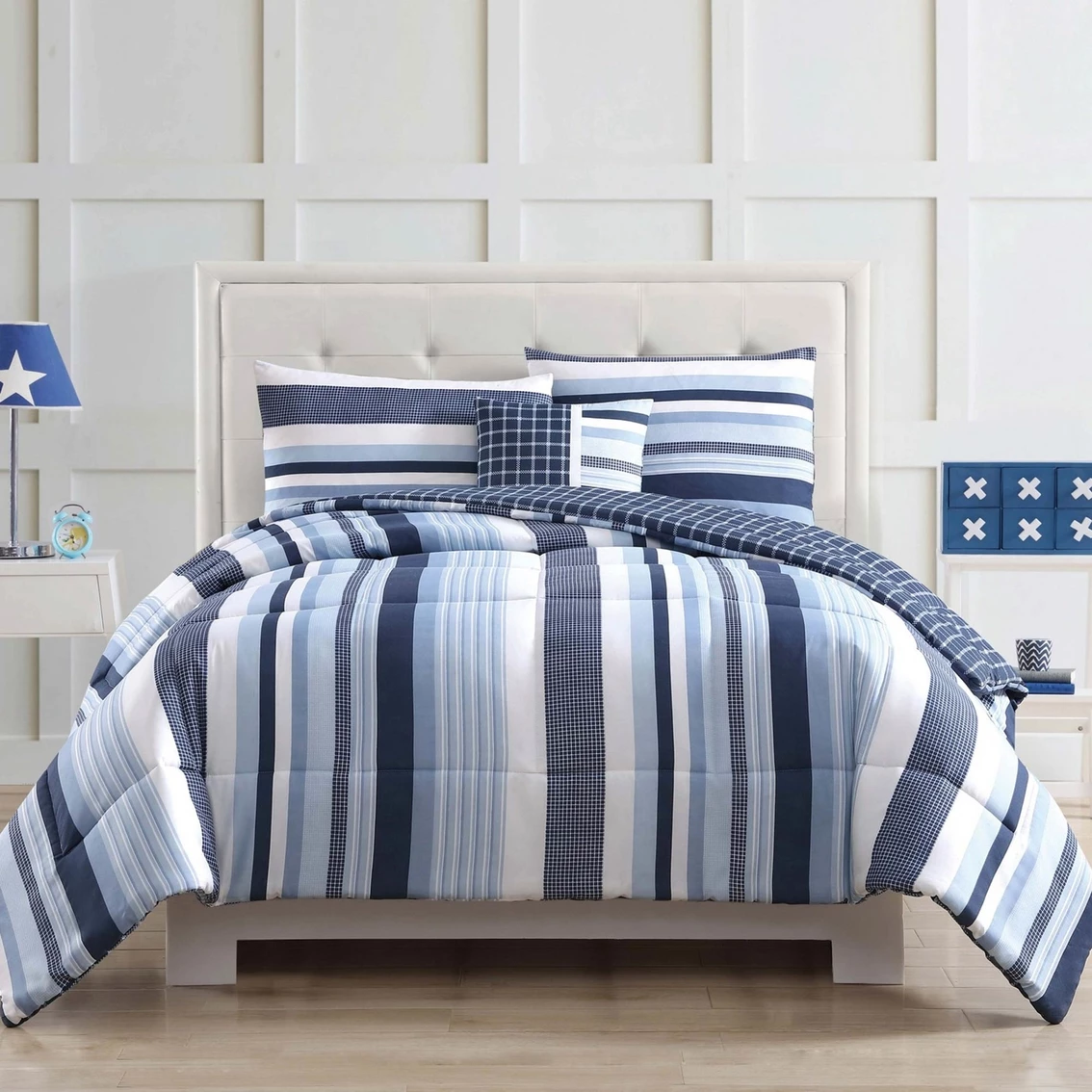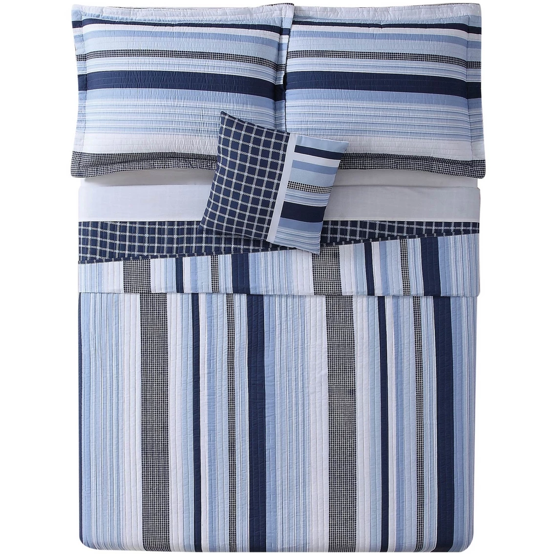 The My World Mason Stripe Quilt Set brings a classic, nautical element to your child’s bedroom. Made from 100 percent polyester microfiber and heat-set quilting, you’ll get the softness and durability you need. You’ll also receive a bonus anchor decorative pillow with the quilt set. Lightweight fill and fabric keeps you cool during the warm months, but durable enough to last year round. Twin set includes quilt, standard sham and throw pillow. Full set includes quilt, two standard shams and throw pillow. Style: QS1939.