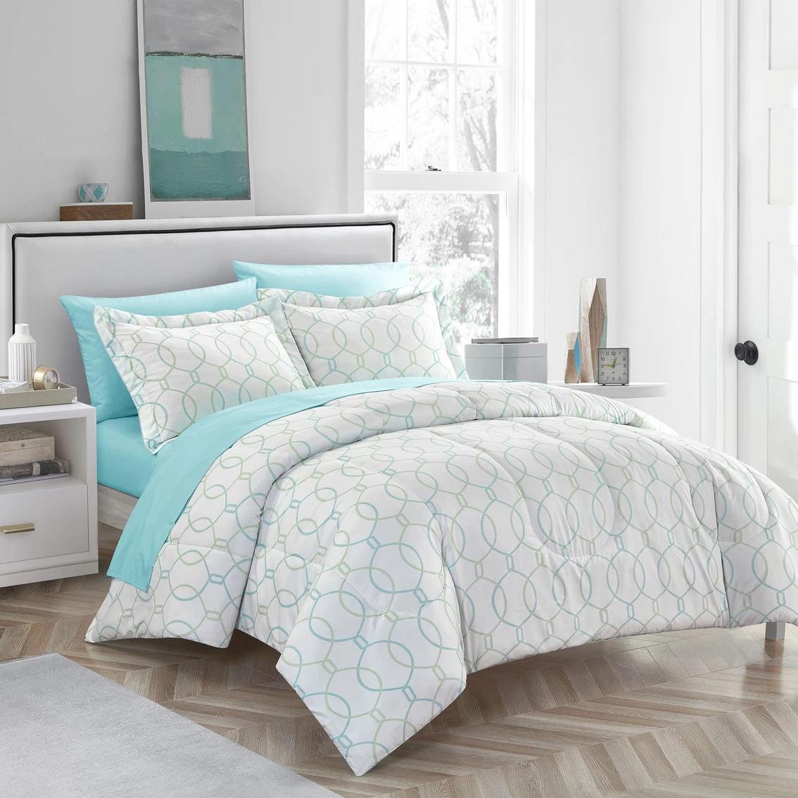 The chic Nanshing America Monarch 7-pc. Bed-in-a Bag is sure to make a statement in any bedroom with its delicate mix of interlocking circles in tones of aqua and sage on a crisp white ground. Bed-in-a-Bag set includes 4-pc. sheet set, comforter and two pillow shams. Model: MONARCH7.