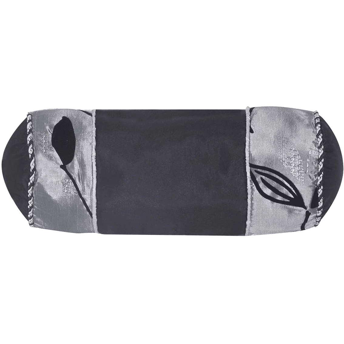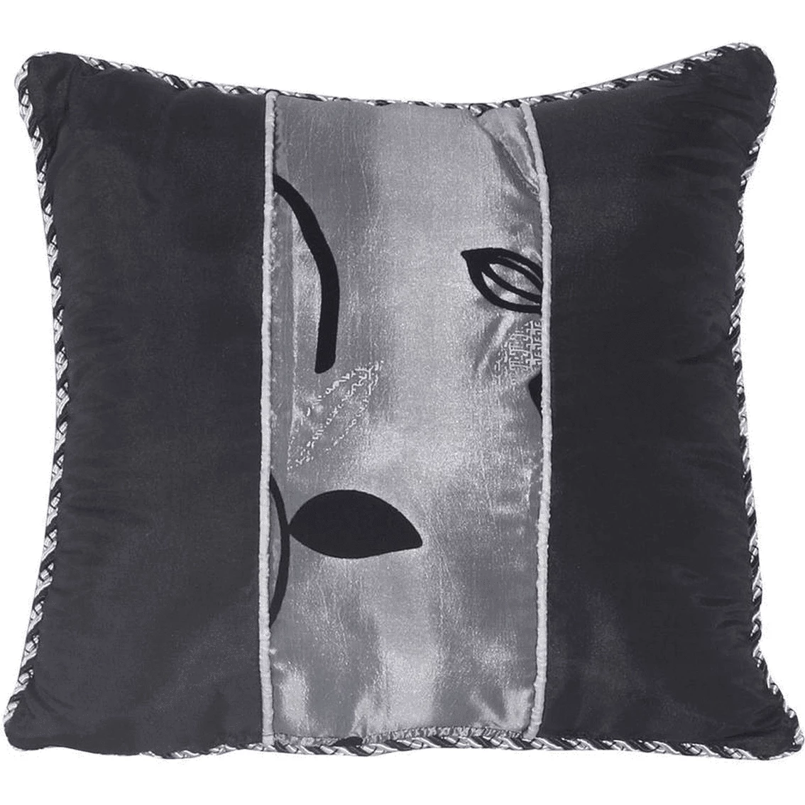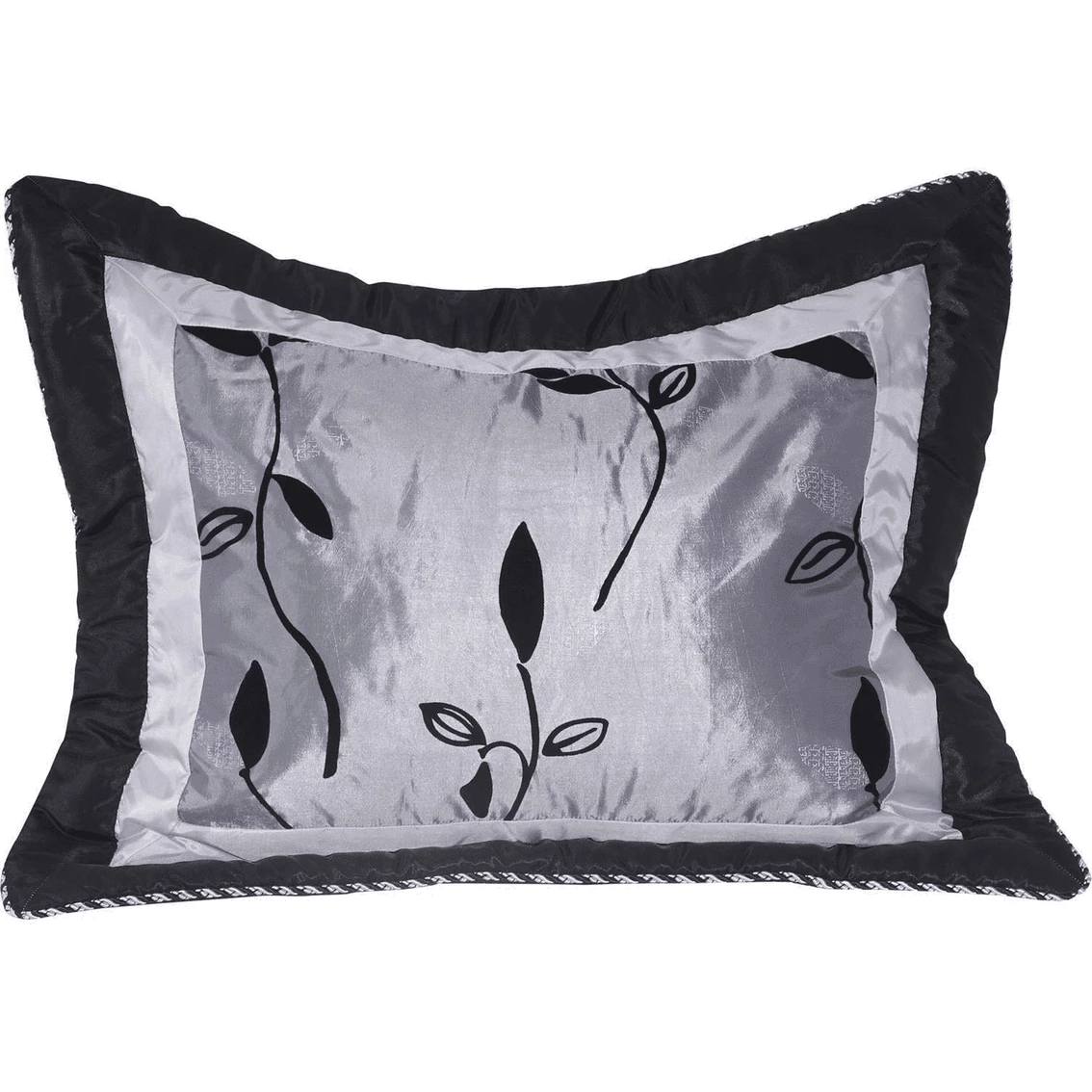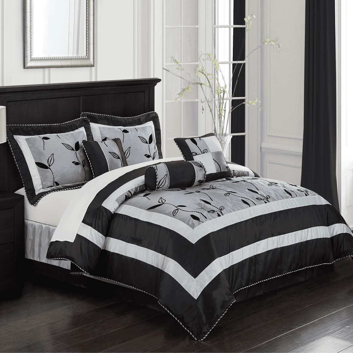 The Pastora comforter features a black flocked modern leaf pattern with metallic print accents on taffeta fabric, framed in bands of contrasting colors and finished with a corded trim along the edge. The matching shams are also framed in taffeta and finished with the same corded trim. The comforter and decorative pillows are filled with polyester for a soft comfy loft without being too heavy. Coordinating pillows add interest with a pieced checkered pattern, center band of the flocked fabric pieced with solid, and a neck roll is finished with piping. Matching shams fit standard size bed pillows and also have the corded trim. The tailored bedskirt is accented with a band of contrasting fabric. Style: PASTORA7.