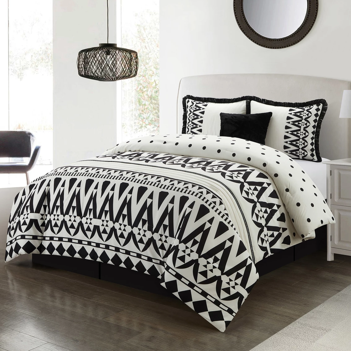 Add a bohemian touch to the style of your bedroom with this beautiful black and white Petula 5 pc. Comforter Set from Nanshing. Made from premium microfiber, this set is sure to add a modern look to any bedroom while providing the softness to keep you comfortable all through the night. Set includes comforter, bedskirt, two pillow shams and one decorative pillow.