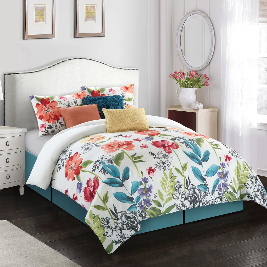 Bring the garden indoors with the Prair 7-piece set from Nanshing. Refresh and update your bedroom with this beautiful floral comforter set. This set features a multi color large scale floral print on the comforter and matching shams. Also included in the ensemble is a bright colored bedskirt and three coordinating decorative pillows in lovely spring hues. Style: PRAIR7.