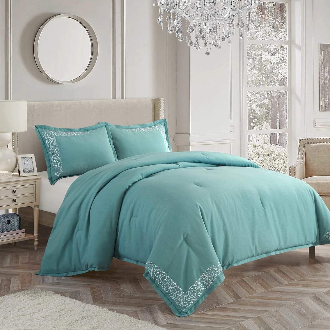 Give your bedroom an elegant make-over with this beautiful 3-Piece comforter set from Nanshing. This set includes a comforter and two matching shams. Each piece is woven from a cotton-polyester blend in a textured weave. A refined embroidery adorns the corners of each piece using a satin stitch technique. Model: Somerset3.