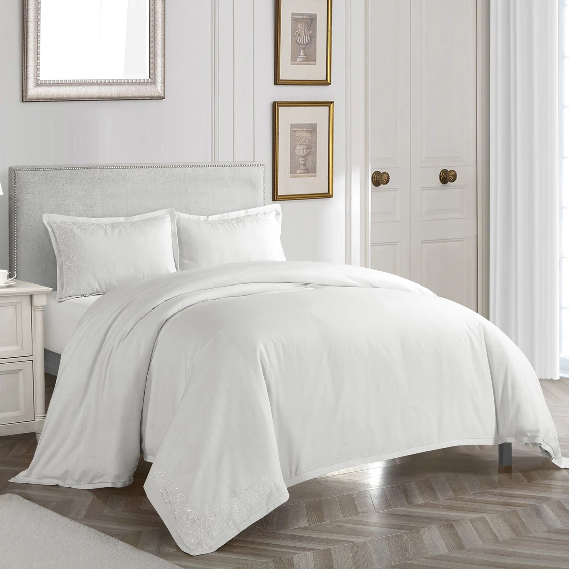 Give your bedroom an elegant make-over with this beautiful 3-Piece duvet set from Nanshing America Inc. This set includes a duvet and two matching shams. Each piece is woven from a cotton-polyester blend in a textured weave. A refined embroidery adorns the corners of each piece using a satin stitch technique. Model: Somerset3-DV.