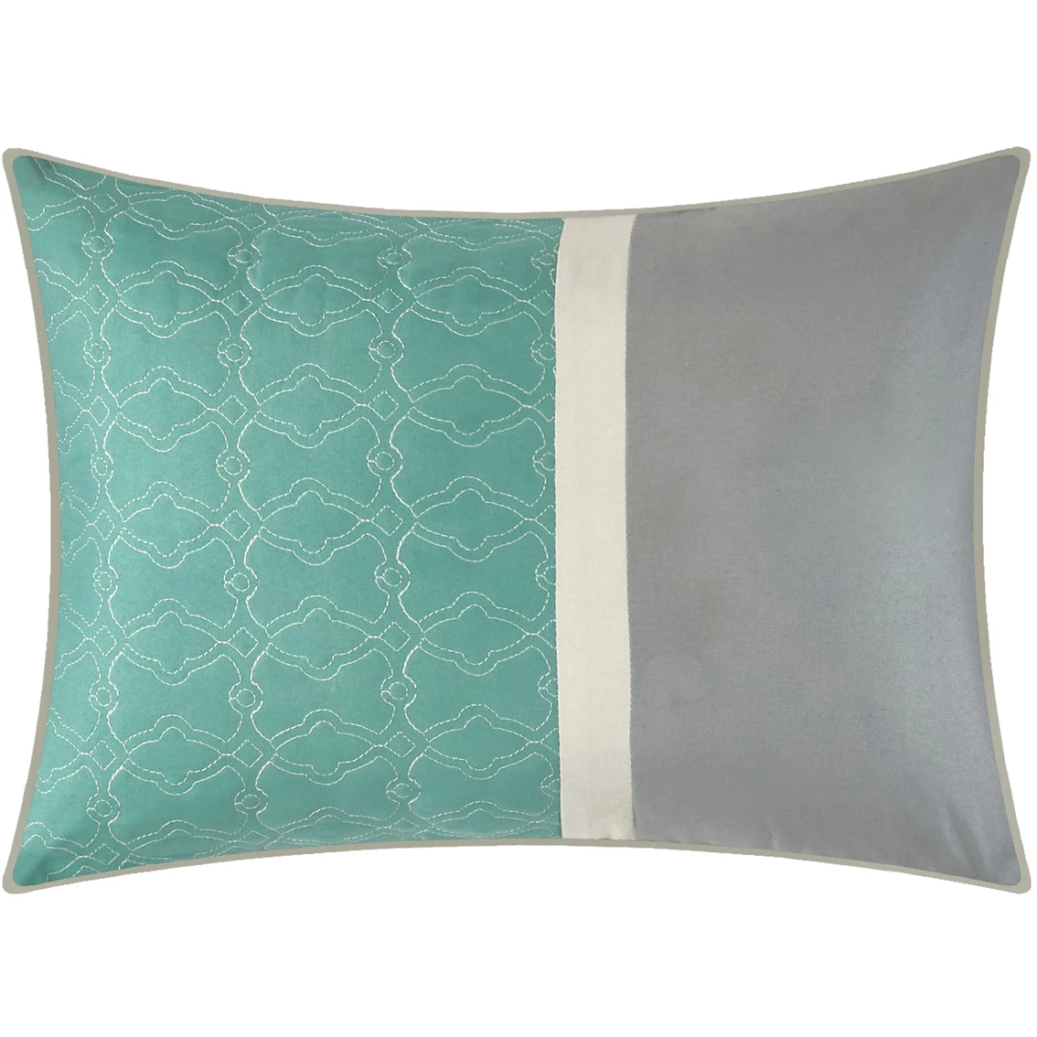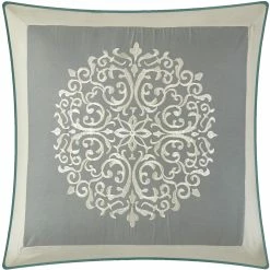 Delicately understated colors and a blend of solid patterns and geometric lines create a lovely ambiance in your bedroom with the Nanshing America Inc. Reina 7 Pc. Comforter Set. This complete set will help you to create your dream sleep space with one effortless step. Set includes comforter, 2 pillow shams, bed skirt and 3 decorative pillows. Style: REINA7.