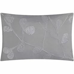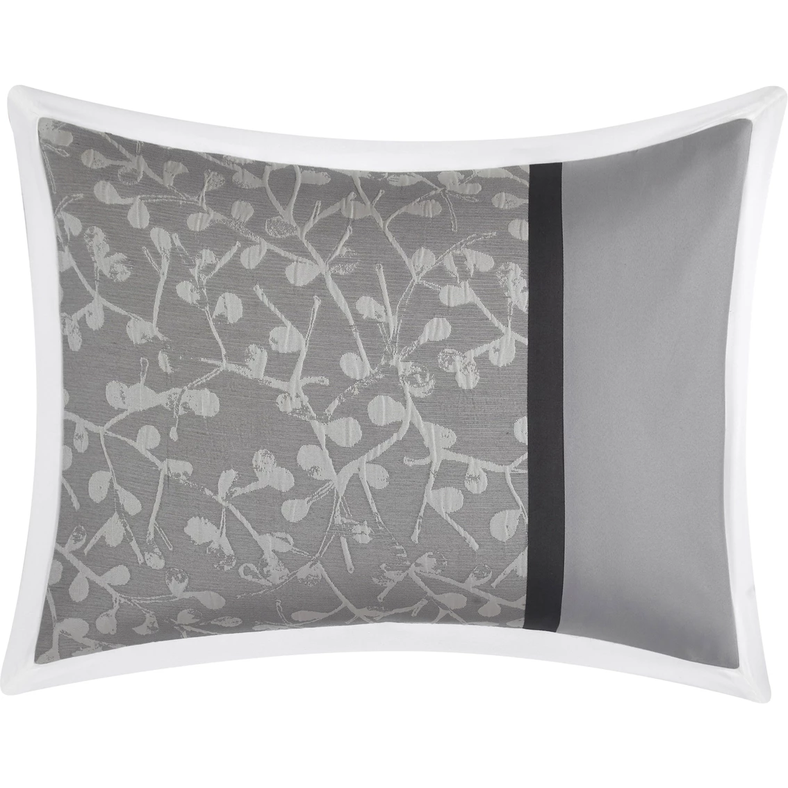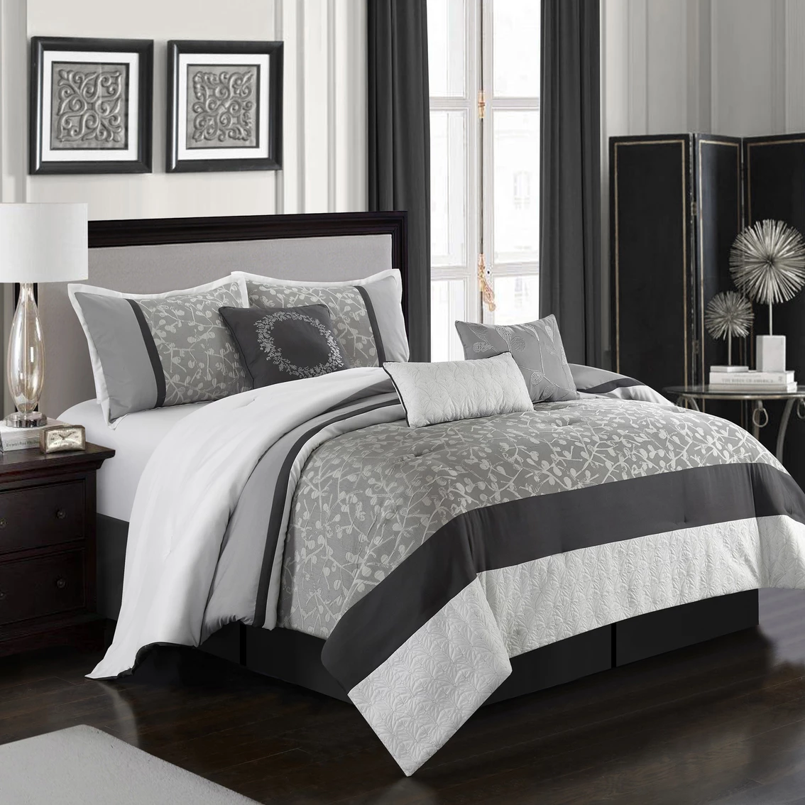 Bring subtle elegance into your bedroom with the Nanshing America Inc. Willow Grey 7 Pc. Comforter Set. This set combines a botanical jacquard pattern and a coordinating quilted design in shades of grey. This transitional ensemble includes a comforter, two pillow shams, a tailored bed skirt and three coordinating decorative pillows. Style: WILLOW7.