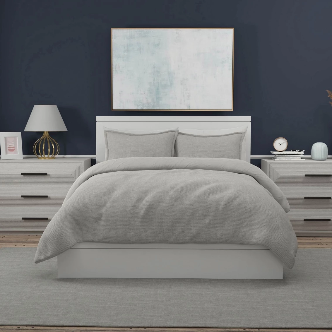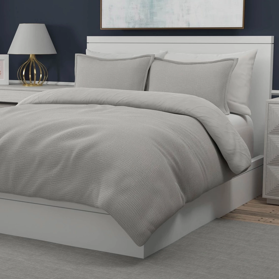 The Portico Crossed Matelasse Comforter Set is designed with naturally breathable and lightweight gray cotton fabric to add a sophisticated touch to your bed. The subtle design is woven into jacquard fabric for added dimension to the bed without adding any additional color. The technique makes the pattern more textured and pronounced while adding lovely details and interest to the fabric. The set is made from 100% cotton fabric and the comforter is filled with 100% polyester for year-round warmth. Our responsibly made items are made better, so that you can live better. The cotton is sustainably produced under the Better Cotton Initiative standards and the set is manufactured following the Oeko-Tex Standard 100 certifications and are verified to be free from harmful levels of more than 350 substances. Style: CSP08FQCM.