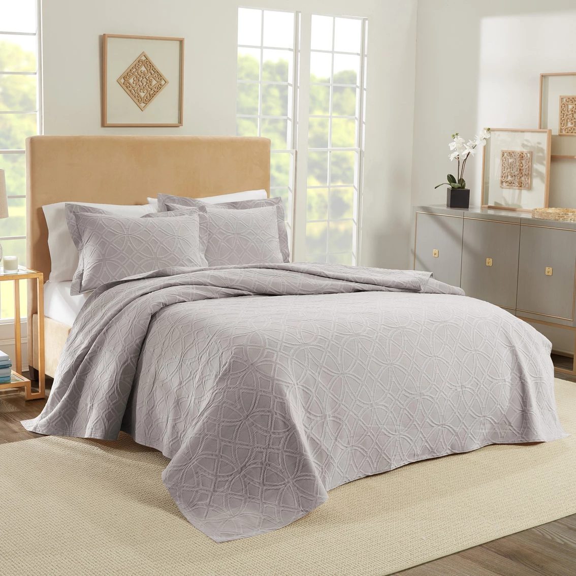 Creating an oasis is easy with the interlocking ring pattern of the Bogart Coverlet Set. This classic deign adds an air of sophistication to any room while offering the comfort you crave. Made from 100% combed cotton for a luxurious quality that will last for years to come.