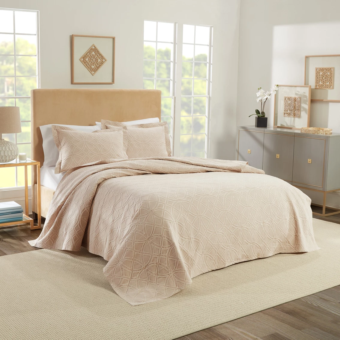 Creating an oasis is easy with the interlocking ring pattern of the Realeza Bogart Coverlet Set. This classic design adds an air of sophistication to any room, while offering the comfort you crave. Made from 100% combed cotton for a luxurious quality that will last for years to come.