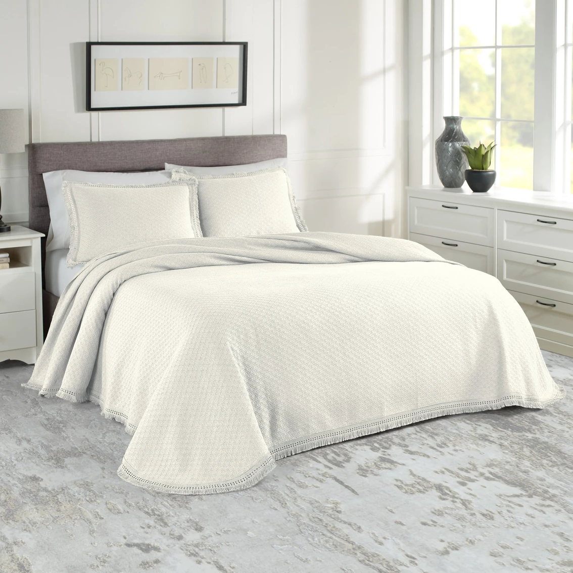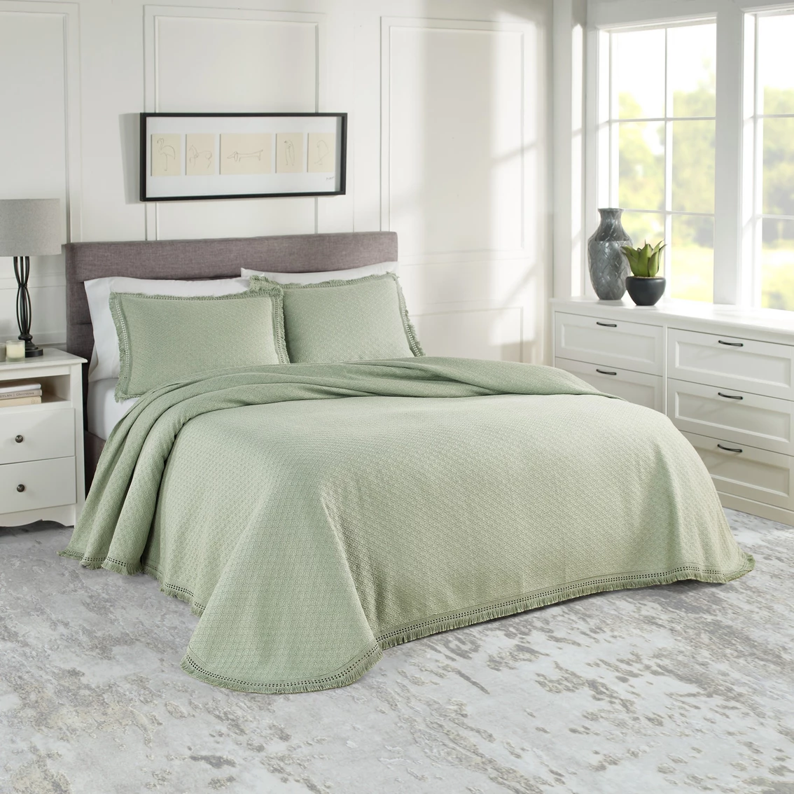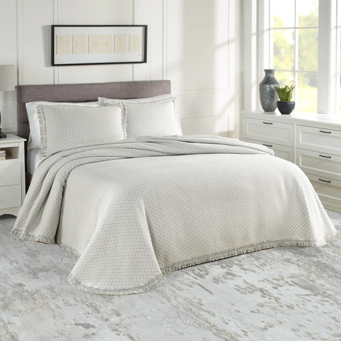Turn your bedroom in to a luxurious sanctuary with the Realeza Woven Jacquard Bedspread Set. Featuring the simple elegance of a diamond design with a fringed hem, this high quality woven bedding adds soft visual appeal to your bed. The soft and cozy feel will have you drifting to sleep in no time! Includes: 1 bedspread 120 x 102 in. and 2 standard shams 21 x 27 in. Model: M33QBWJGR.