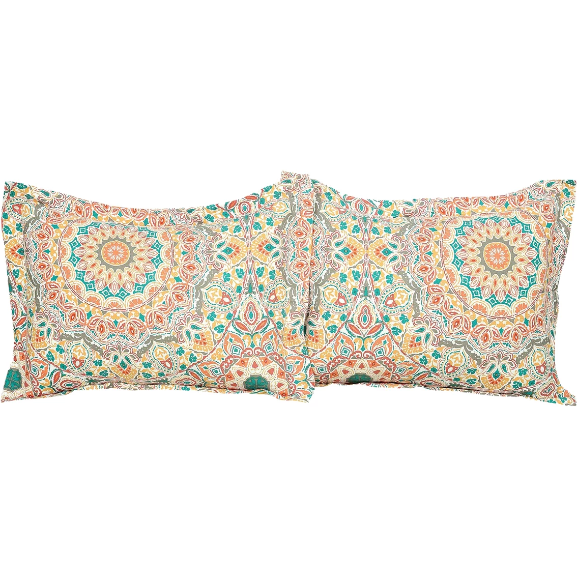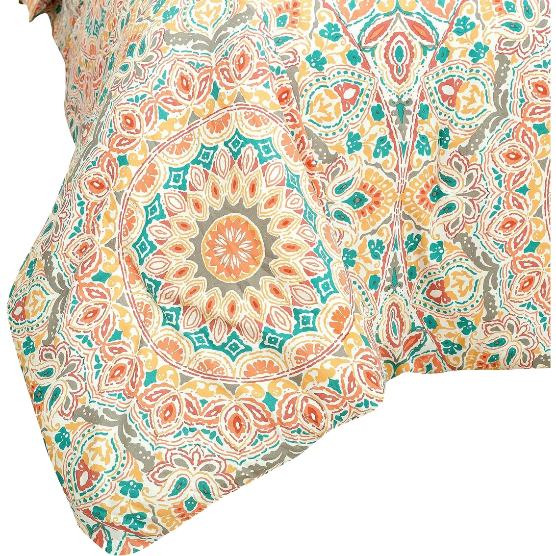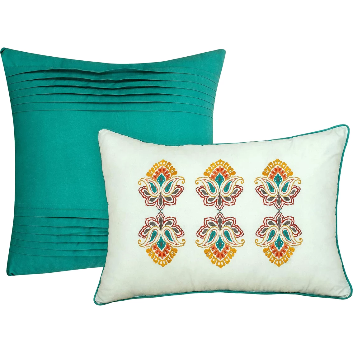 Add comfort and style to your bedroom with the ultra-soft and breathable Royale Linens Cozumel Medallion 5-piece Comforter Set. The face of the comforter and shams feature a multi-colored medallion print and reverses to a horizontal stripe in coordinating colors. The 16 x 16 inch square decorative pillow is a solid aqua with pleats going across the top and bottom. The 12 x 16 inch decorative pillow is solid white with an aqua piping border and multi-colored embroidery on the face. This stylish color and design combination will complement almost any room’s decor. All components are made of 100% polyester microfiber to keep you cozy all night long, and the easy-care fabric will make washing and drying a breeze. The Cozumel Medallion 5-piece Comforter Set is available in full/queen and king sizes, and includes a comforter, shams, one square decorative pillow and one oblong decorative pillow. Style: 09A93F04-043-0997.