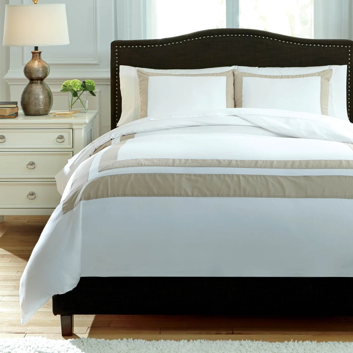 p style=”color:red”Due to supply chain issues, your order could take a little longer. As a top furniture brand serving the Exchange and its customers, Ashley Furniture is dedicated to remedying these issues. Thank you for your patience./pThe Signature Design by Ashley Andor Duvet Cover Set features a framed effect, creating a clean and classic design in versatile white with a sand border. Set has a 300 thread-count cotton body with linen/cotton panels. The 3-piece set includes duvet cover (insert not included) and two shams.
