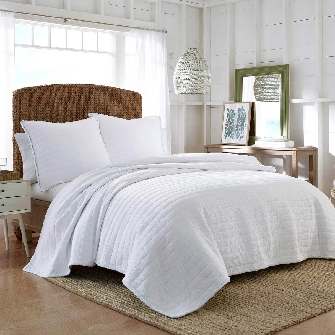 Featuring a classic white face and a cool, teal reverse, the Southern Tide Mar Vista Quilt brightens up your bedding décor. Cotton rich and channel quilted for a touch of texture, it’s the perfect piece for draping over your bed as an additional comfy and cozy layer. And, its raw-edge trims add a trendy touch. Inspired by some of the most beautiful elements in the world, the Southern Tide Mar Vista Quilt offers craftsmanship, clean lines and fine quality. Available in Twin, Full/Queen and King sizes, it pairs perfectly with the Southern Tide Mar Vista Euro Pillow Sham. With Southern Tide, the South is more than just a location, it’s a state of mind. The brand is all about the classic American lifestyle and it always brings a piece of the South wherever it goes. The premier Southern label appeals to those with an adventurous spirit, an affection for the coast, and an appreciation for classic design. Machine wash cold with similar colors on gentle cycle. Do not bleach. Tumble dry low, remove promptly. Warm iron as needed. Quilt face made of 99% Cotton/1% Spandex; reverse and fill: 100% Cotton. Coordinates with the Southern Tide Mar Vista Euro Pillow Sham.