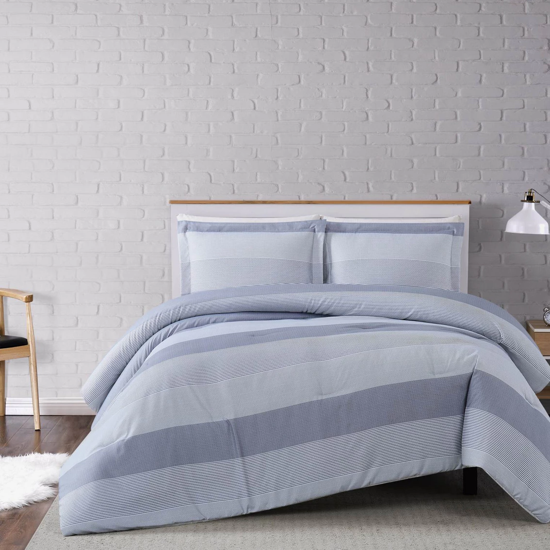 This modern gray horizontal stripe pattern features larger stripes surrounded by smaller coordinating stripes and varied gray shades in Truly Soft fabric for softness and performance you can count on. The fabric is 100% brushed microfiber with our special Truly Soft treatment. Comforters are filled with 100% polyester fiber filling. This item is machine washable, but please be sure to use appropriate sized machinery to avoid any excess wear on the items. This item is manufactured and imported from China. Style: CS3225FQ-1500.