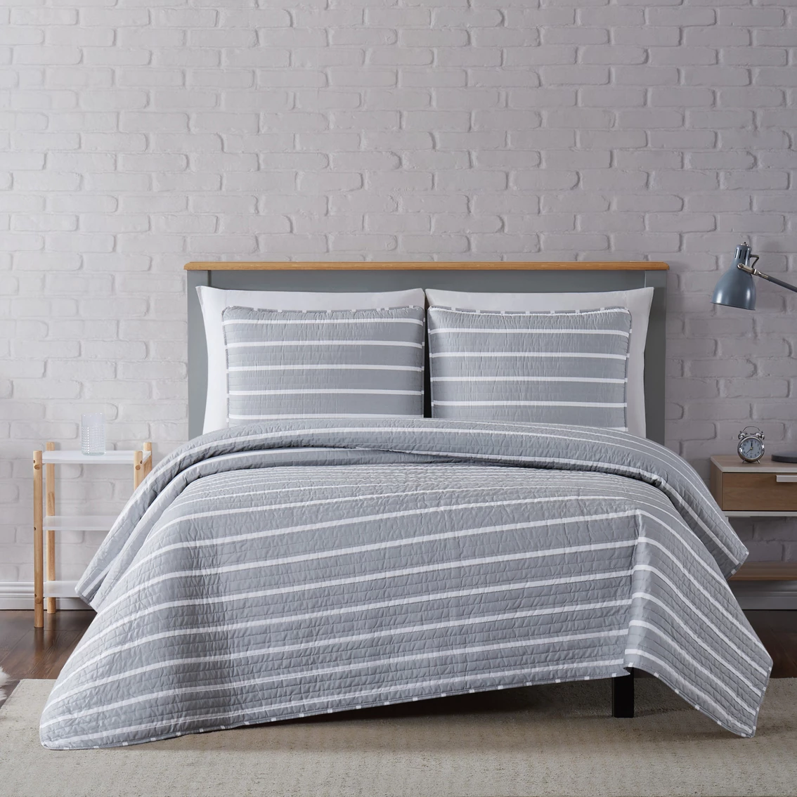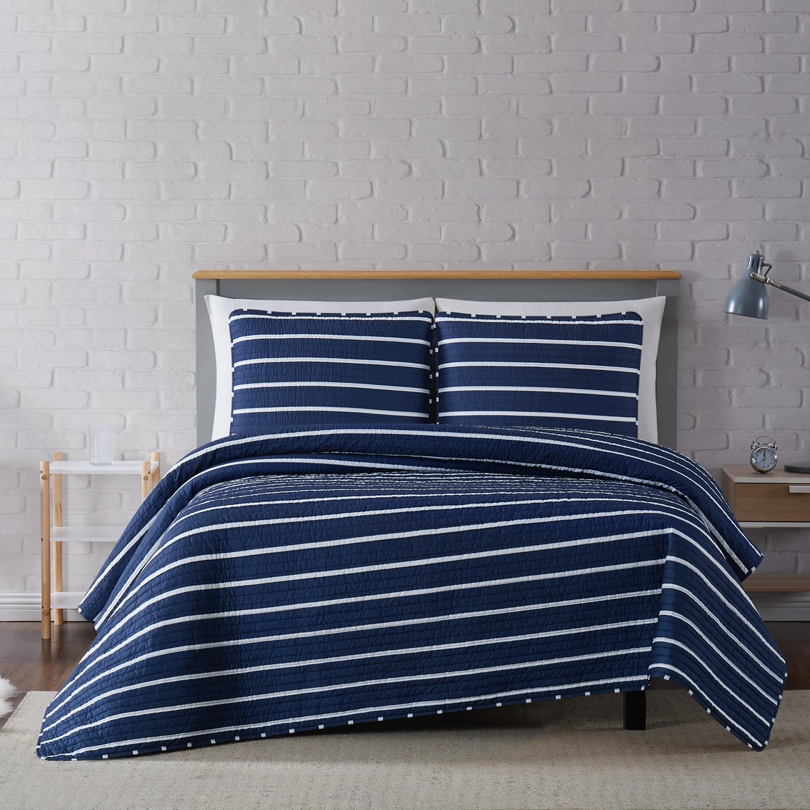 This easy to coordinate quilt set from Truly Soft features horizontal white stripes on a dyed background and is a quick way to coordinate to a variety of rooms. The face and back are 100% microfiber with cotton and polyester blended filling. This item is machine washable, but please be sure to use appropriate sized machinery to avoid any excess wear on the items. Style: QS3069.