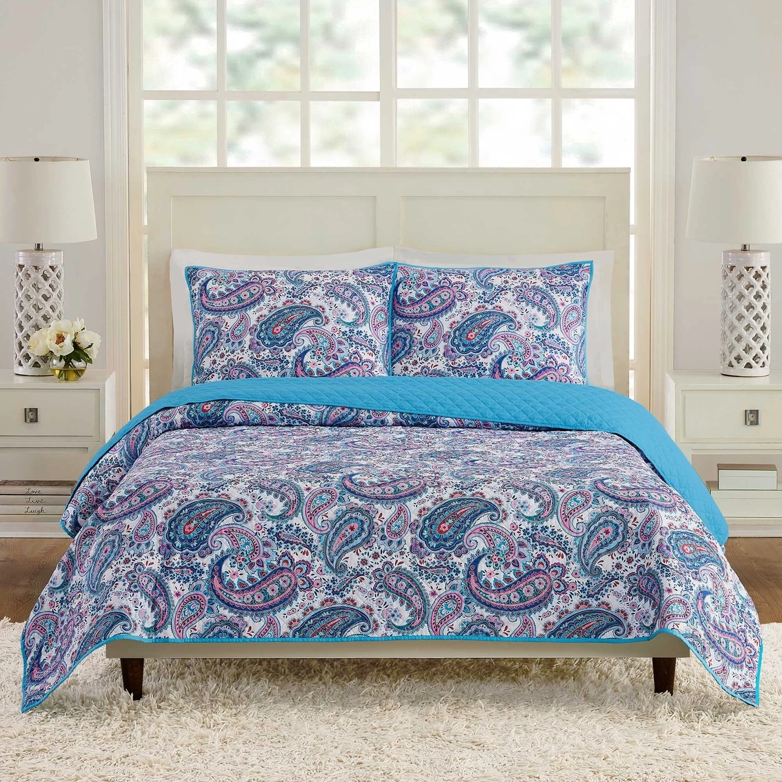 Brighten your room with the Haymarket Paisley Quilt. This intricate paisley is bursting with blooms in shades of blue, pink, and violet. The pattern is designed on white ground and reverses to a coordinating blue solid. The diagonal grid quilting pattern gives this quilt more texture and design. This cozy quilt is made of super soft brushed polyester fabric with a cotton blend fill. Includes quilt and two pillow shams. Model: A019222PRNDS.