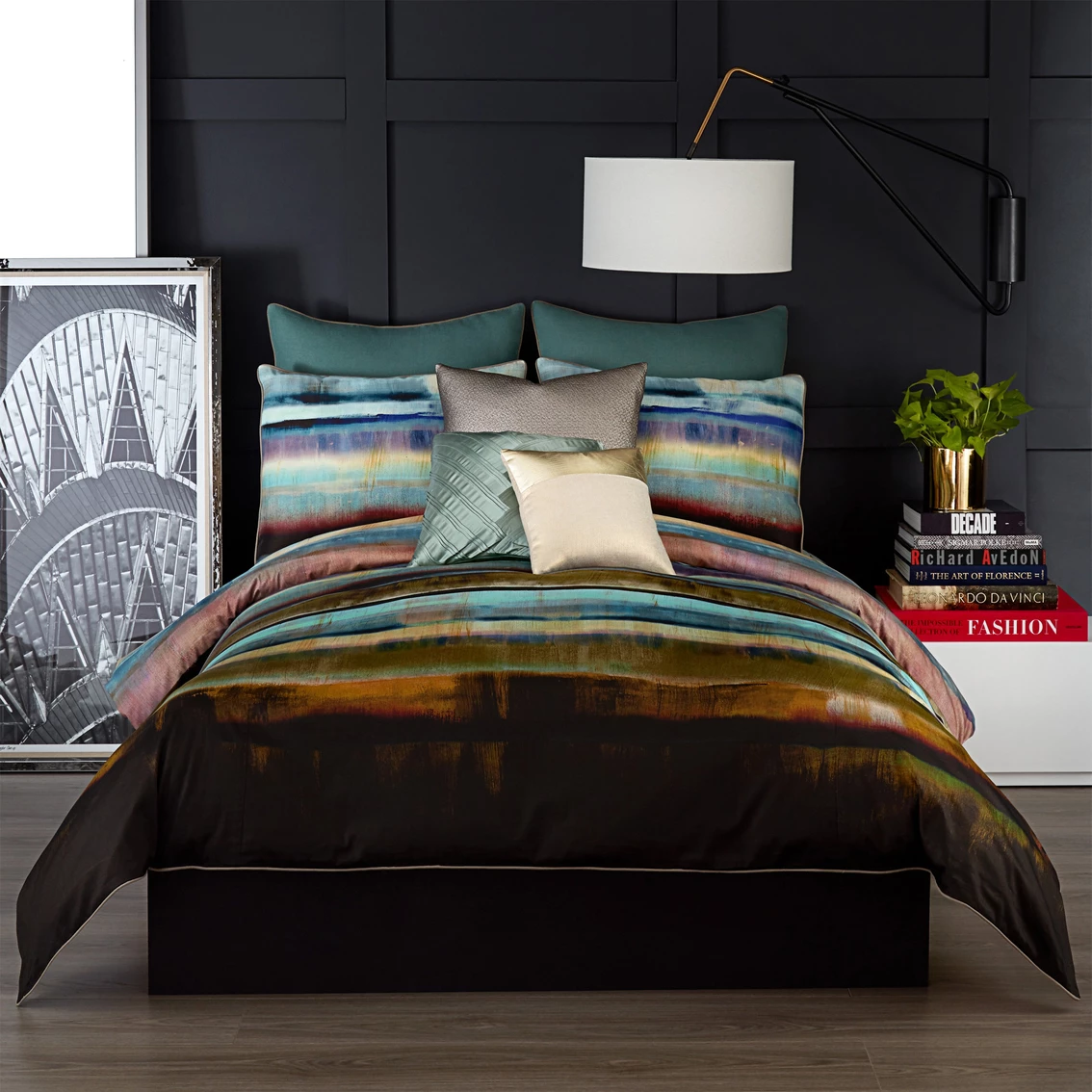 This Vince Camuto comforter set has a classic watercolor brush stroke that takes inspiration from current fashion large panel prints. Face cloth is 100% cotton sateen with a reverse of 100% microfiber solid color. This item is machine washable; however, please make sure equipment is large enough to allow the item to move freely in wash. Made in China. Style: DCS1143FQ-1800.
